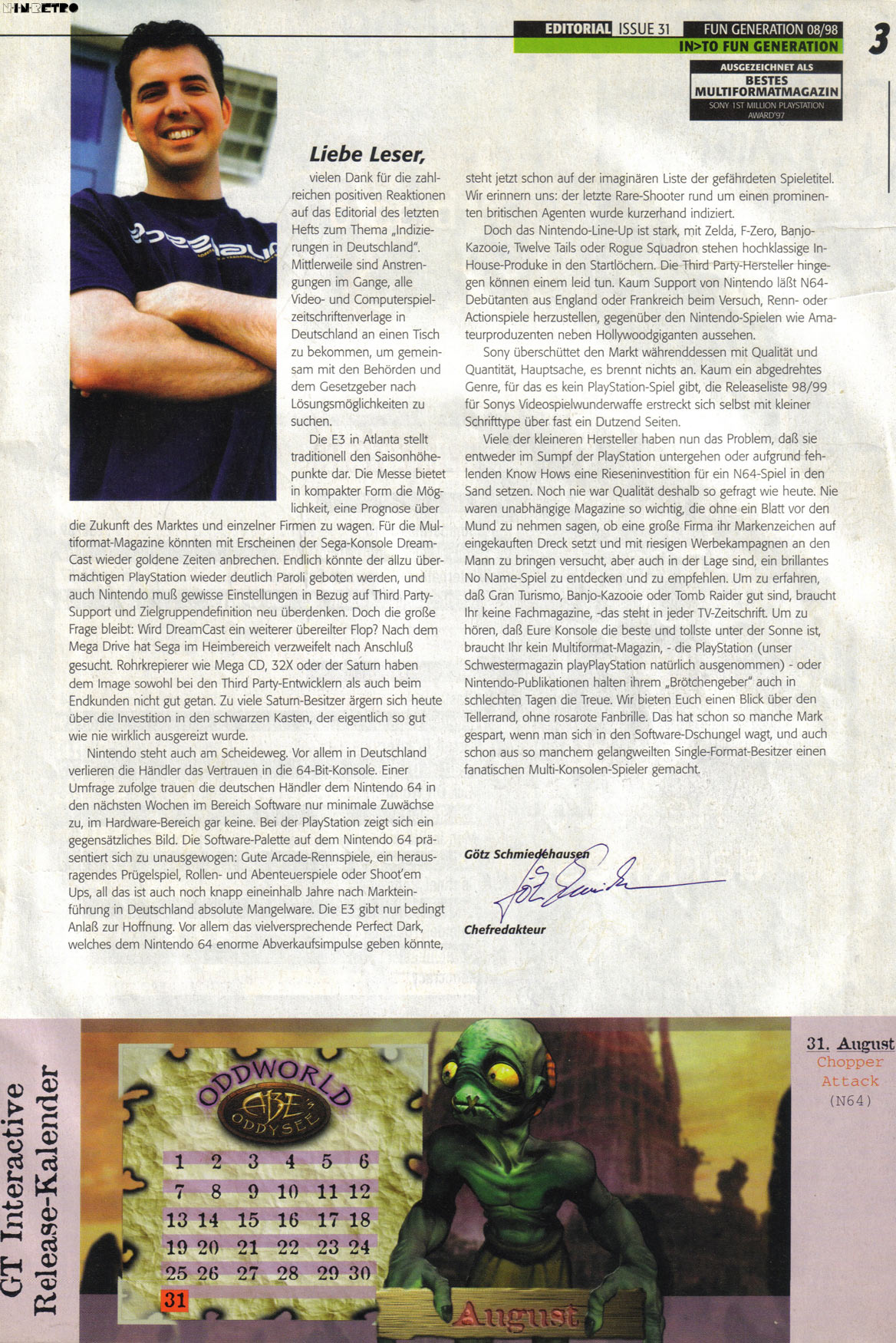 Es werden nur Beiträge zu Konsolenthemen gelistet die für N.i.n.Retro eine Relevanz haben. Reviews sowie Berichte zu Computerspiele, oder Konsolensysteme die nicht auf dieser Internetseite gelistet sind, werden nicht berücksichtigt sofern diese in der jeweiligen Ausgabe vorhanden sind. (Betrifft zum größten Teil nur Zeitschriften die sich neben Videospiele auch mit Computersystemen beschäftigt haben.)