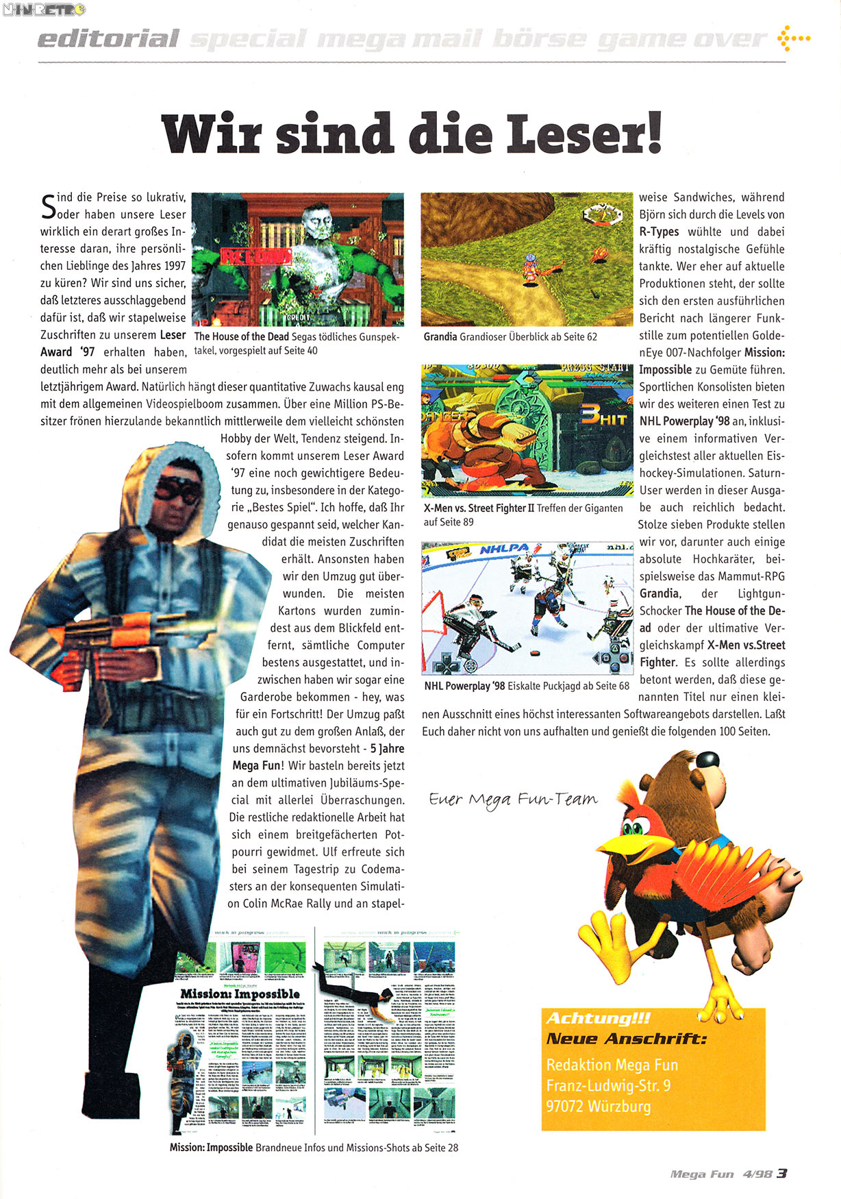 Es werden nur Beiträge zu Konsolenthemen gelistet die für N.i.n.Retro eine Relevanz haben. Reviews sowie Berichte zu Computerspiele, oder Konsolensysteme die nicht auf dieser Internetseite gelistet sind, werden nicht berücksichtigt sofern diese in der jeweiligen Ausgabe vorhanden sind. (Betrifft zum größten Teil nur Zeitschriften die sich neben Videospiele auch mit Computersystemen beschäftigt haben.)