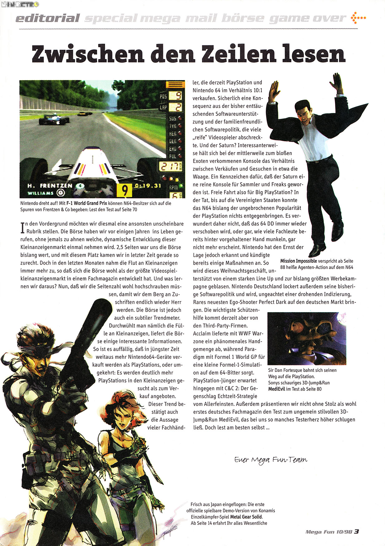 Es werden nur Beiträge zu Konsolenthemen gelistet die für N.i.n.Retro eine Relevanz haben. Reviews sowie Berichte zu Computerspiele, oder Konsolensysteme die nicht auf dieser Internetseite gelistet sind, werden nicht berücksichtigt sofern diese in der jeweiligen Ausgabe vorhanden sind. (Betrifft zum größten Teil nur Zeitschriften die sich neben Videospiele auch mit Computersystemen beschäftigt haben.)