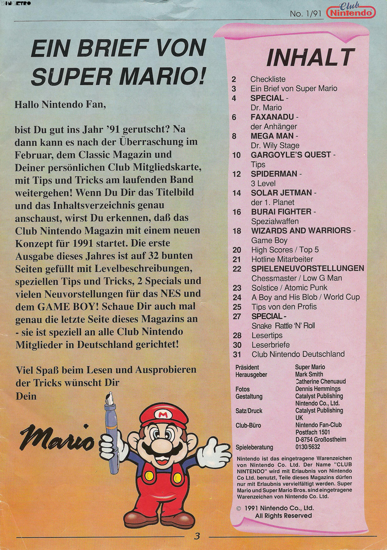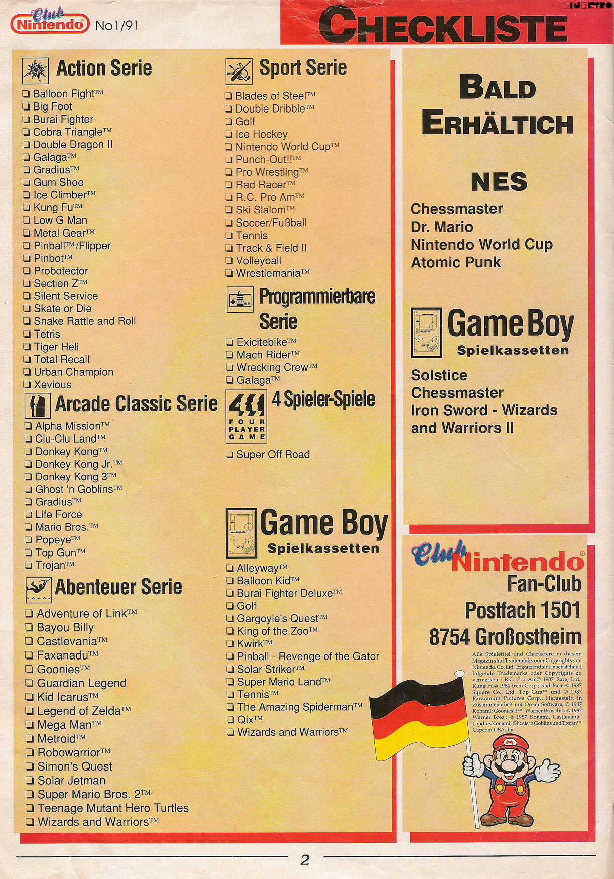 Wenn ich mich recht erinnere, hatten die Club Nintendo-Hefte damals schon einen großen Einfluss auf uns (also mich und damalsige Freunde die ebenfalls ein NES oder/und einen GB hatten). Allein wenn ich mir diese Ausgabe ansehe, denke ich, dass ich damals erst durch das Magazin überhaupt von Spielen wie Faxanadu, Mega Man, Gargoyle's Quest, Solar Jetman, Burai Fighter, Fortress of Fear, usw. erfahren habe. Großartig Werbung im TV gab es zu den genannten Spielen nicht und ich selbst, habe erst 1992 angefangen, regelmässig Fachzeitschriften zu kaufen. Wobei da viele Spiele auch eher untergegangen sind als im Club Nintendo-Magazin, wo die Titel meist etwas auffälliger Präsentiert wurden. Von daher waren diese Hefte schon ein ziemlich großer Werbeträger für Nintendo.