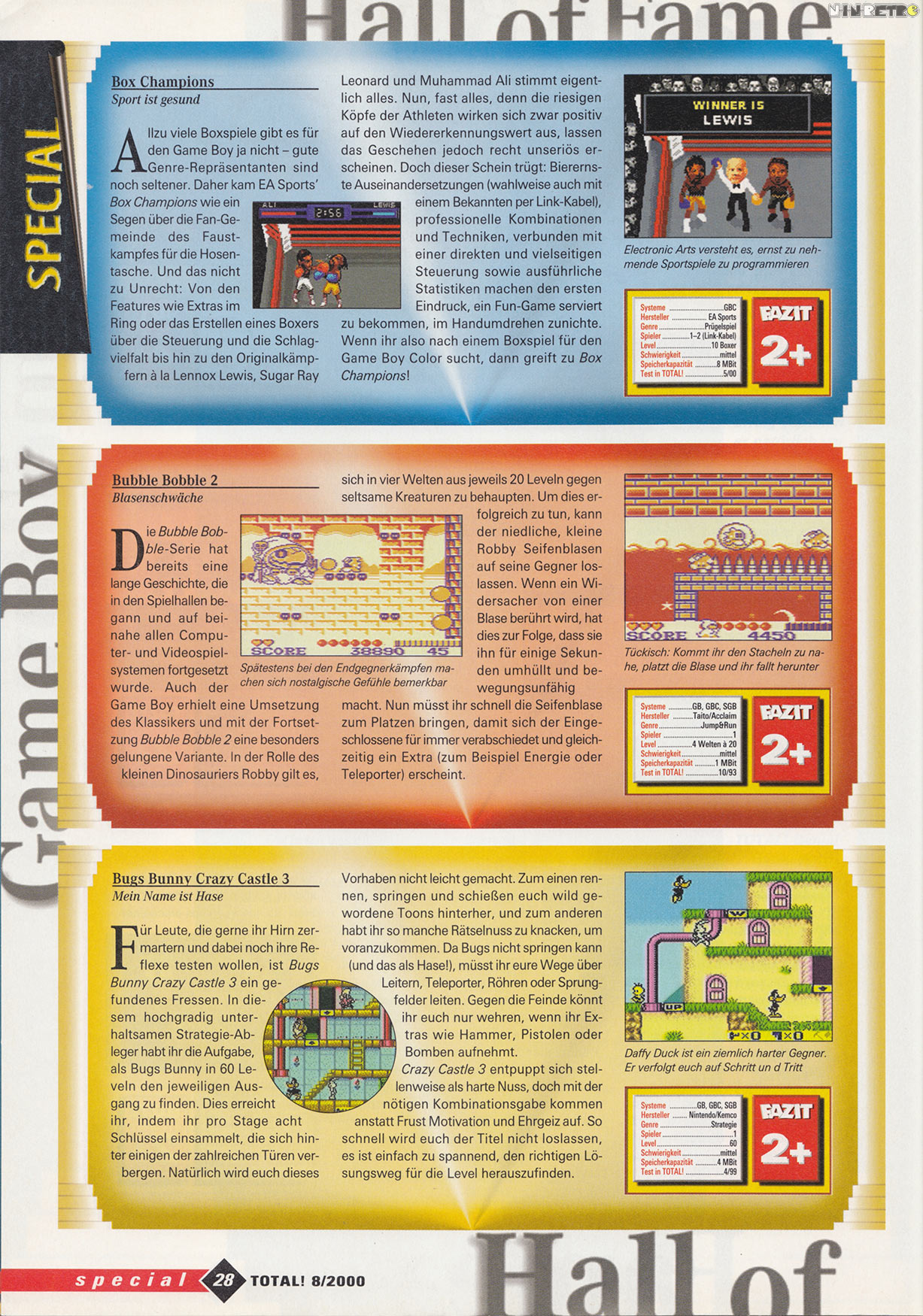 Klasse Scans. Schöne Beiträge am Ende einer wahren Ära. Schade das die Zeitschriften so etwas nicht bei allen Konsolen gemacht haben. Heute gibt es ja richtige Retromagazine die genau solche Sachen bringen. Der Game Boy hat wirklich einige gute Spiele gehabt. Auch wenn die nachfolgenden Geräte besser und interessanter sind (Leistung, Funktionen, Handlichkeit, Design), der kleine Graue ist aus der Geschichte nicht wegzudenken. An die ersten oder frühen Heimkonsolen erinnern sich nur wenige, selbst das Atari erwähnt Heute kaum noch jemand. Das wird dem Game Boy wohl kaum passieren.