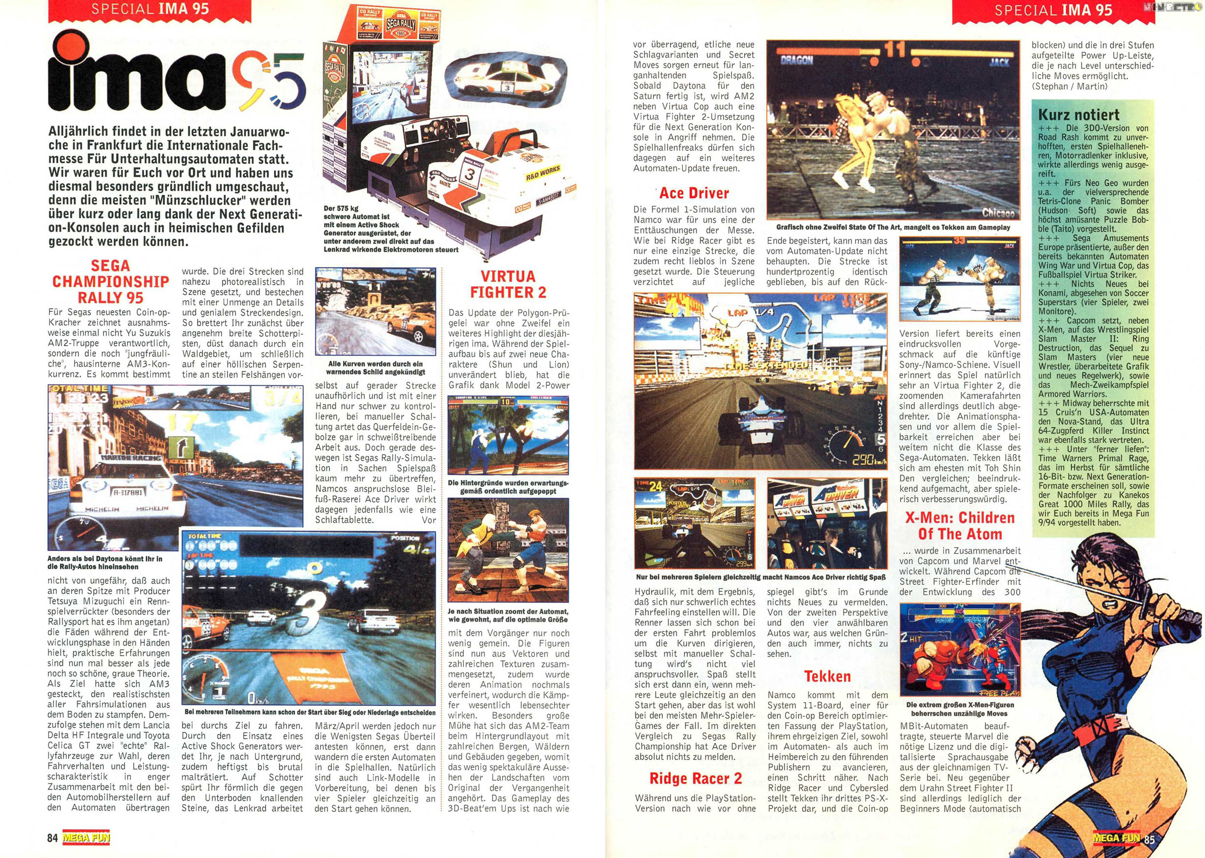 Ich hatte ja fast alle Ausgaben der Mega Fun und diese auch immer komplett gelesen. Ein Monat ist eine lange Zeit und diese Zeitschriften waren das Einzige worauf man sich als "Videospieler" jeden Monat wie auf Weihnachten freute! Jedenfalls sind es immer wieder die Screenshots und der Text dazu die für gewaltige Deja-vu Erlebnisse sorgen. Ich erinnere mich an damals wie ich das Bild zu Sega Rally angeguckt habe und dann "hier konnte man anders als bei Daytona USA in die Autos reingucken". Sowas vergisst man nie, vor allem wenn man die Hefte mehrmals (auch manchmal am Klo ) gelesen hat. Ich fand diese Messeberichte immer so spannend weil man die "Grafik von morgen" sehen konnte. Internet gab es ja noch keines. Die Screens in diesem Bericht sehen so knackscharf aus und man sieht natürlich dass sie vom Arcade-Model stammen. Diese Automaten haben mit modernster Platine meist zwischen 8.000 und 20.000 Euro gekostet wodurch man so eine Grafik logischerweise nicht daheim auf PC oder Konsole erwarten konnte. Trotzdem dachte ich da immer "wann werden wir so eine Grafik wirklich zu Hause erleben können?" Als Kind/Jugendlicher ist so eine Grafik ja zehnmal aufregender und interessanter als später weil man sich noch viel mehr hypen lässt und damals war 3D-Grafik auch gerade völlig neu und sowas wie "High-Tech".