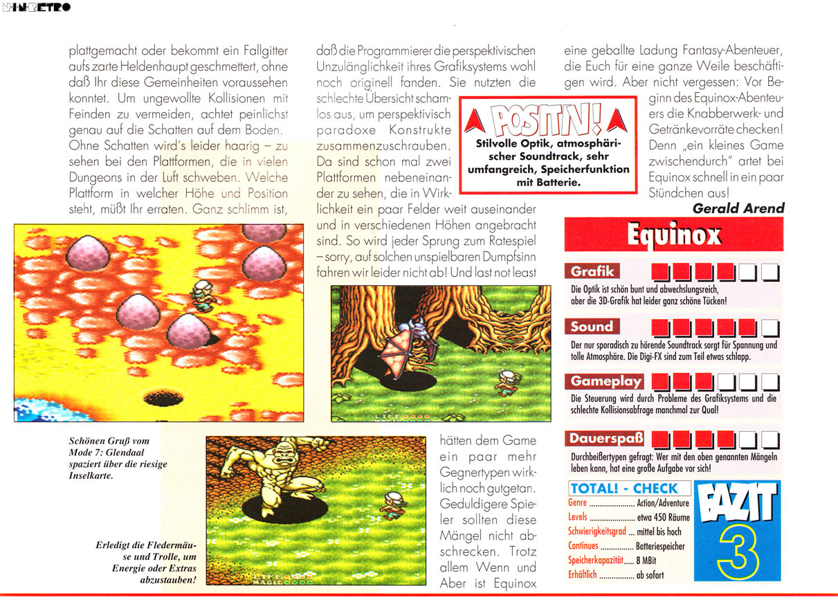 Wie schon auf dem NES bedarf die notwendigerweise vereinfachte und damit leider irreführende perspektivische Darstellung eigentlich einiger grafischer Hilfsmittel, um die Positionen der Objekte im dreidimensionalen Raum zweifelsfrei ausmachen zu können. Während Solstice derer noch keine aufweist und Sprünge daher nicht selten zum Glücksspiel verkommen, stellt Equinox zumindest Schlagschatten unterhalb schwebender Plattformen, Fallen und Gegner dar, um es dem Spieler zu erleichtern, deren Positionen auf X- und Y-Achse zu bestimmen. Das ist eindeutig ein Fortschritt, genügt aber leider nicht. Um auch die Höhe erfolgreich bestimmen zu können, wäre es erforderlich gewesen, diese mit Hilfe einer Farbskala für die verschiedenen Etagen, einblendbarer Hilslinien oder sonstiger geeigneter Maßnahmen kenntlich zu machen. Dass die Entwickler und gar die Tester dies nicht bemerkt haben könnten, kann ich nicht glauben. Schade um das verschenkte Potential.
