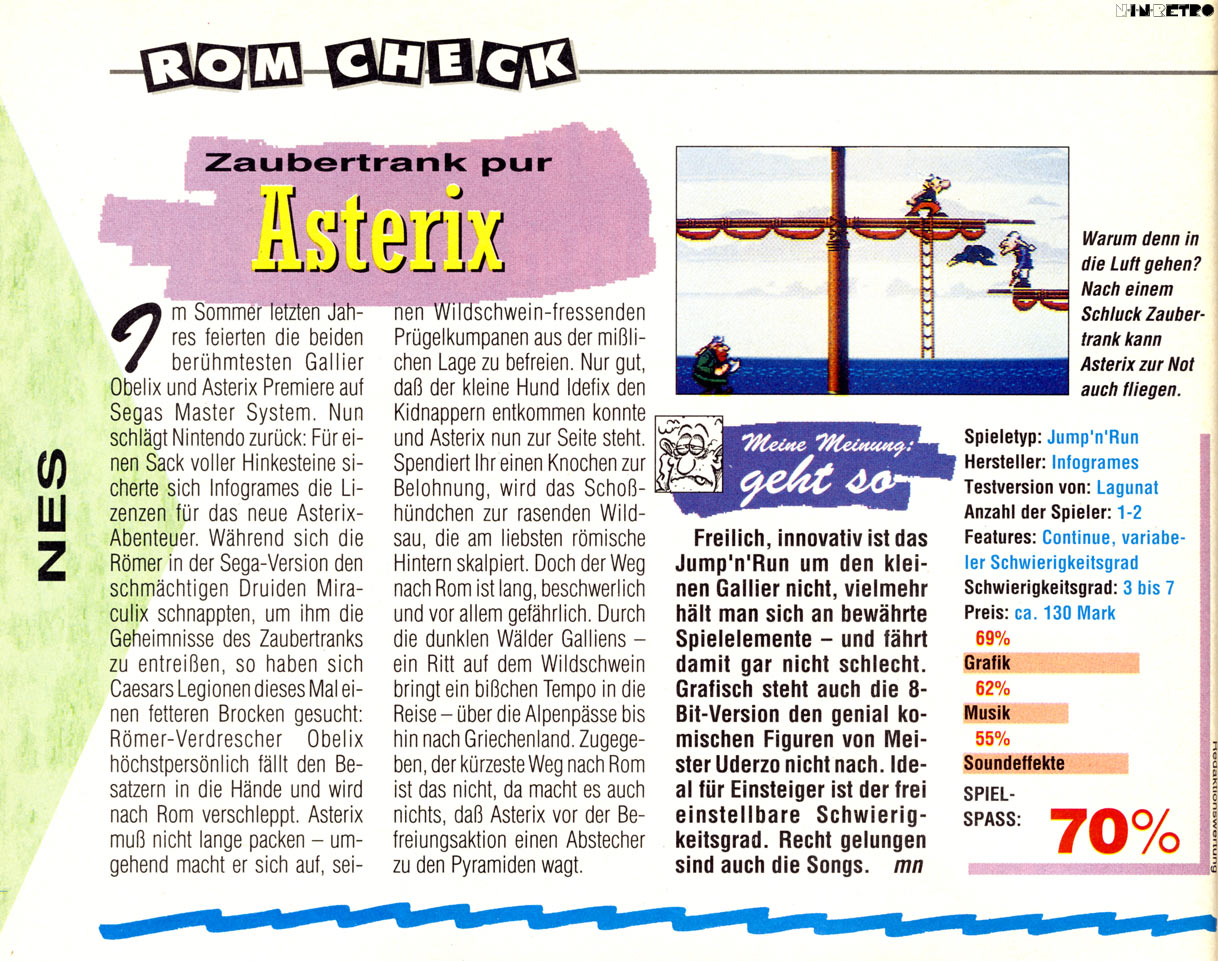 Ansonsten war es auf dem MS ein super Spiel, auf dem NES kenne ich nur den (ordentlichen) Gameboy Ableger. Spiele 1993 waren auf dem NES ja auch nicht mehr taufrisch, die Zielgruppe klar Europa und es kamen ja dann noch weitere Asterix-Spiele raus. Weiß nicht, inwieweit sich das "gelohnt" hat für Infogrames.