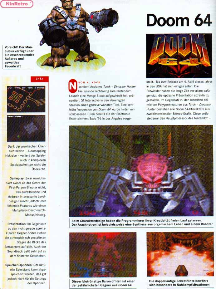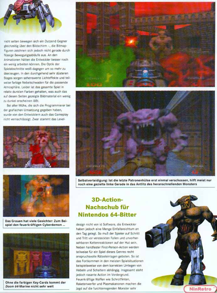 "Die allgemeinen Kritikpunkte an Doom 64 waren hingegen, dass es immer noch nicht möglich sei, zu springen, zu ducken oder auf und ab zu schauen. Außerdem gab es keinen Multiplayermodus im Spiel.,,