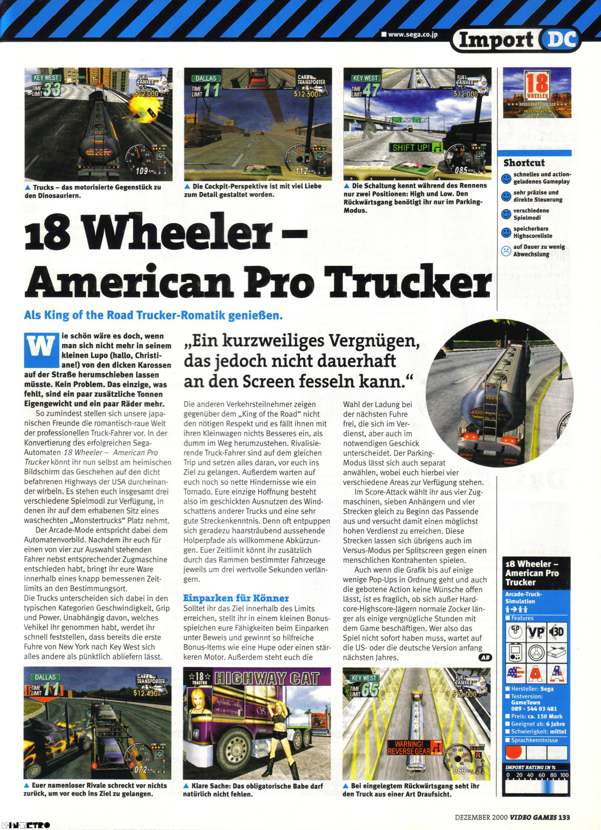 Herrliche Arcade-Umsetzung, die insbesondere mit Lenkrad einfach perfektes Trucker-Feeling nach Hause bringt. Leider kein Titel mit Langzeitmotivation aber allemal ein schöner Titel, der perfekt ins außergewöhnliche Dreamcast-Line up passt.