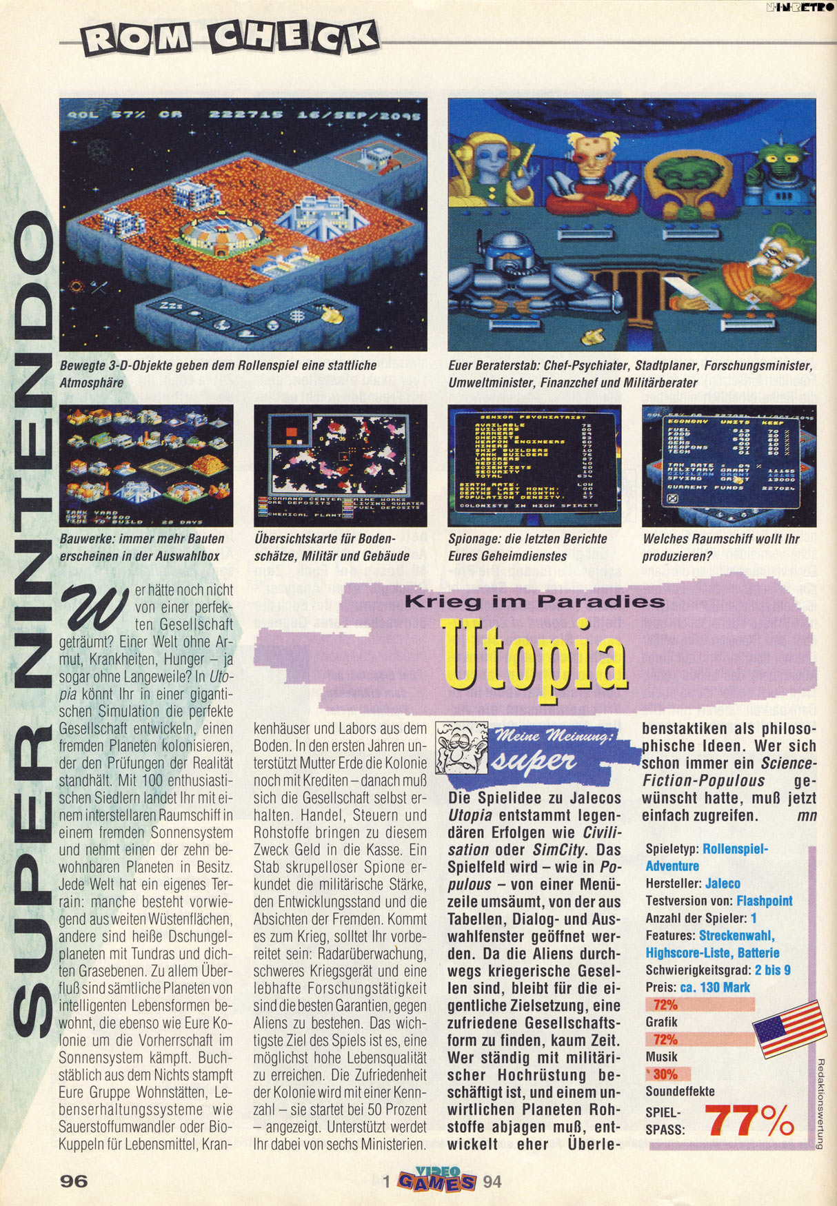 Ein ganzer Planet steht Ihnen und Ihren Kolonisten zur Verfügung, um die perfekte Gesellschaft zu errichten, in der jedermann einen Lebensstandard von 100% genießt. Dazu müssen Sie unzählige Entscheidungen treffen, und Sie stehen unter Zeitdruck, denn zehn verschiedene außerirdische Lebensformen brennen darauf, Ihre Kolonie in Staub zu verwandeln. Komfortabel über Symbolflächen zu steuern und mit einem exzellenten 3D-Spielfeld, wird Sie Utopia in seinen Bann schlagen und läßt Sie nicht eher ruhen, bis Sie Ihren Planeten zu einem "Garten Eden" gemacht haben.