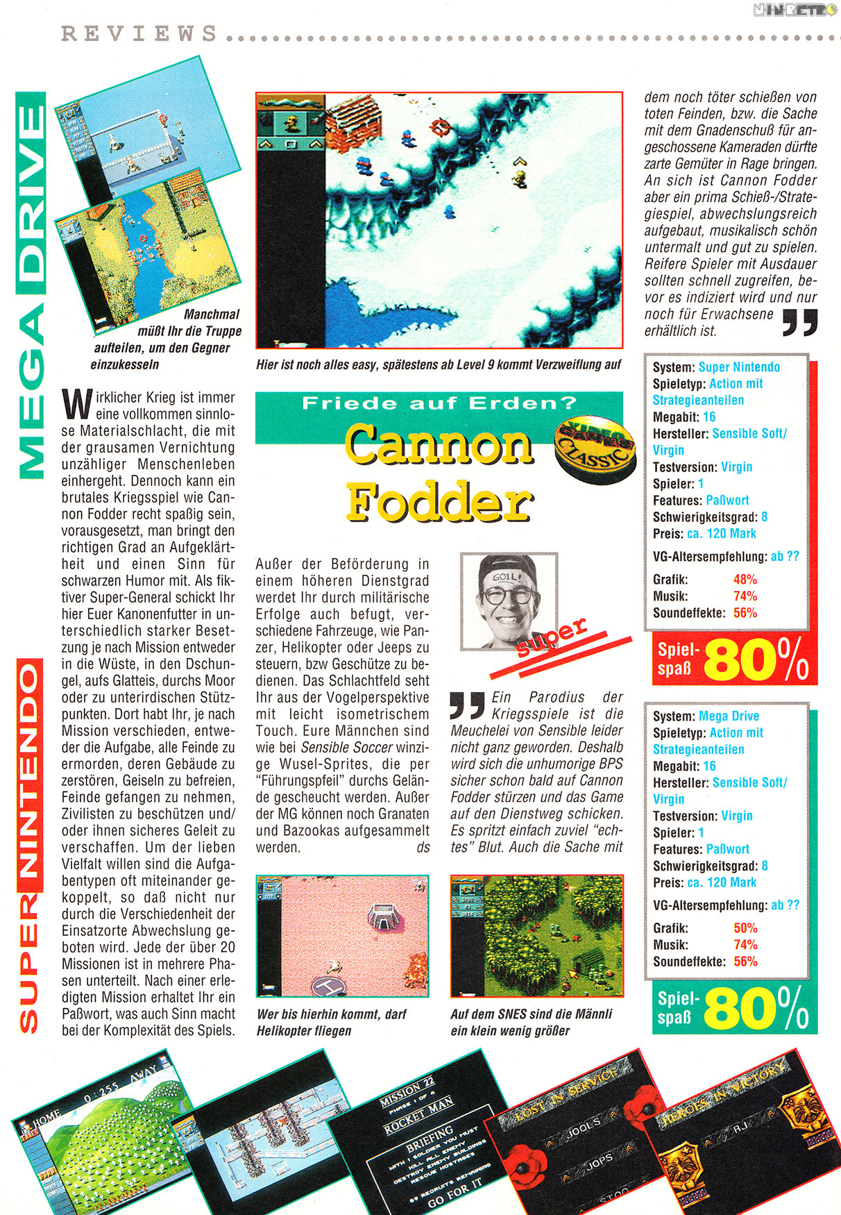 Habe es kürzlich auf beiden Konsolen angespielt; auf dem SNES zieht das Spiel gegenüber der Mega Drive-Version meiner Meinung nach minimal den Kürzeren, weil aufgrund des auflösungsbedingt kleineren Bildausschnitts etwas weniger Übersicht geboten wird - die marginal schlechtere Grafikwertung in der Video Games-Rezension macht also Sinn. Wenn man pingelig ist, könnte man der SNES-Version sogar blassere Farben vorwerfen. Die Musik ist auf dem SNES freilich besser, dafür machen auf dem Mega Drive die Soundeffekte mehr her. Würde sogar behaupten, dass das Knattern der Maschinengewehre auf dem MD fieser klingt als in allen anderen Versionen, das Amiga-Original eingeschlossen.