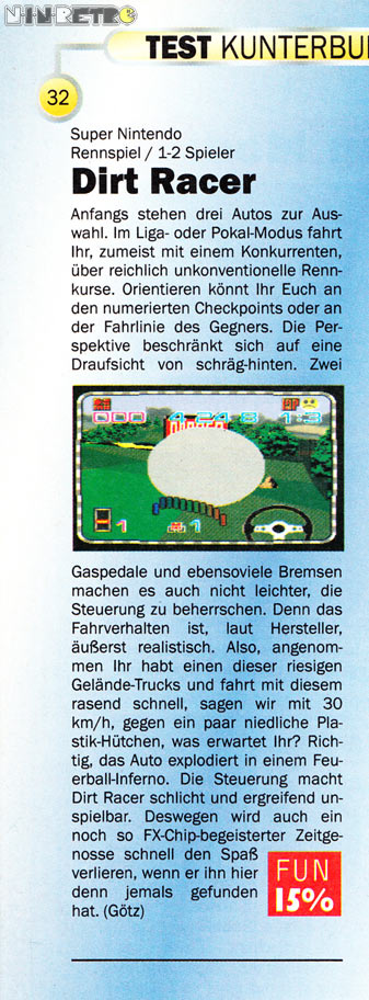 Dieses Spiel ist so schlecht, das man es schon wieder gespielt haben muss. Nur um mit eigenen Augen gesehen zu haben, wie man trotz FX-Chip ein Spiel komplett vor die Wand fährt.