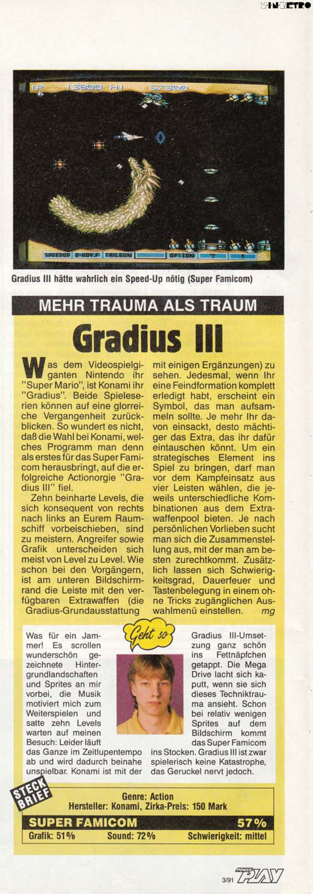 Was bei allem Gejammer über die SNES-Version immer wieder vergessen wird ist, dass bereits das Arcade-Original eine Ruckelorgie ohnegleichen war. Trotzdem gilt Gradius III unter vielen als der beste Teil der Serie. Ich persönlich bevorzuge allerdings Gradius II und Gradius Gaiden.