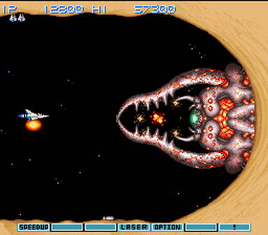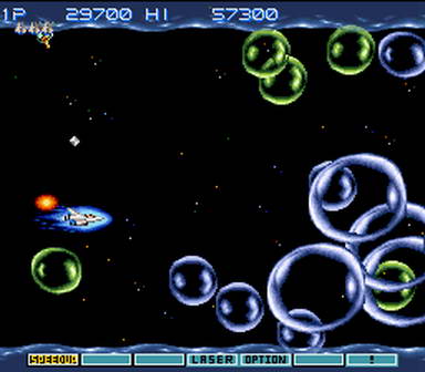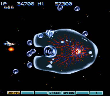 The gentle Gradians thought they were cured of Bacterion's contemptible curse after generation of germ-free living. Guess again. That wretched fiend is once again wreaking havoc on Gradius and the surrounding planets. It's your destiny to put an end to it. Unless maybe you think life as an amoeba would be pleasant!