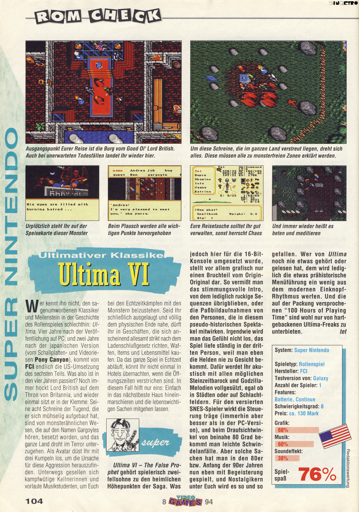Da mir Ultima IX sehr gut gefallen hat, wäre es wirklich eine Überlegung wert Ultima VI evtl. auf dem SNES zu spielen... sieht zumindest nach einer guten Umsetzung aus und die VG-Wertung ist auch nicht unbedingt übel.