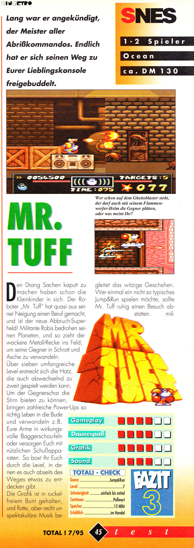 Danke für den Hinweis. Hatte die verlinkte Seite zwar auch über google gefunden, wusste allerdings nicht, ob man deren Angabe trauen kann, da ich sonst absolut gar nichts darüber gefunden habe, dass das Spiel nie veröffentlicht wurde. Habe jetzt mal die Angaben von "???" auf "Nicht erschienen" umgeändert. Müsste dann so passen. Wieso man solche Spiele dann doch nicht veröffentlicht hat, verstehe ich auch nicht. Mr. Tuff schein wohl wirklich so gut wie fertig gewesen zu sein, sonst hätte die Video Games den Titel erst gar nicht getestet. Kam öfter vor, dass sie angekündigte Reviews doch nicht im Heft hatte, weil sie statt einer Final nur eine Beta-Version, mit einigen Fehlern oder fehlenden Features, erhalten hatten, deshalb müsste das "Mr. Tuff"-Testexemplar wirklich schon fertig gewesen sein und ganz soooo übel war die Bewertung ja auch nicht. Na ja... zumindest gibt es dann ja wohl eine Prototype-Version als ROM, die man bei Interesse antesten könnte.