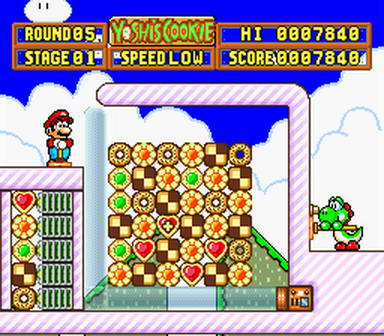 Line up a row of the same kind of cookies either vertically or horizontally, and they vanish! Clear the screen to move on to a new level of cookie chaos. Yoshi appears from time to time to stir things up. Play for high score or go head-to-head against a friend or the computer. The mouth-watering madness doesn't let up!