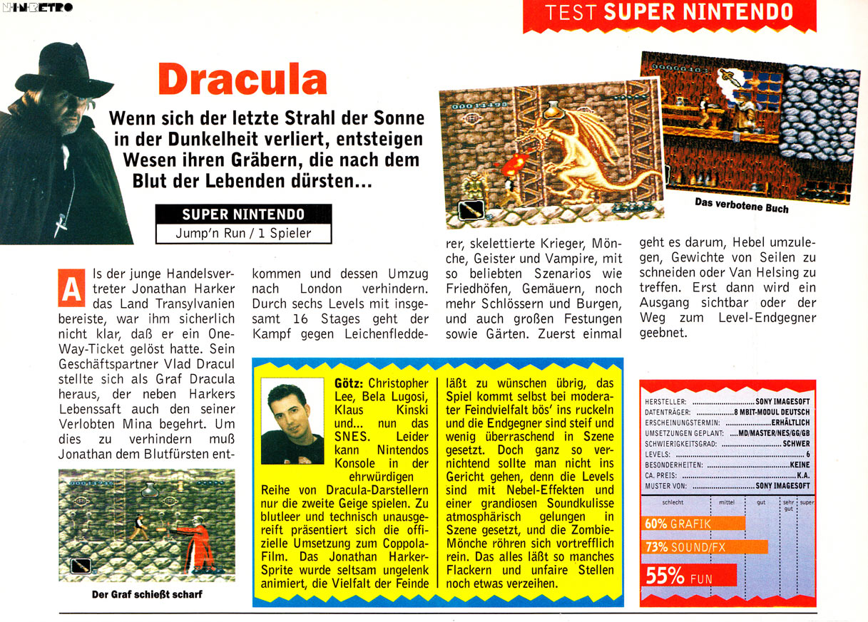 Bram Stokers Dracula für das Super Nintendo Entertainment System geht direkt auf die Hauptschlagader los, mit Action, bei der es dir eiskalt den Rücken runter läuft und die so wirklichkeitsnah ist, daß du deinen Augen nicht trauen wirst! Als der Vampirjäger Jonathan Harker wirst du in diesem superinteraktiven Film tief in die Welt der Untoten gestürzt. Sieben grauenerregende Level, jeweils mit mehreren Tag- und Nachtbereichen, und unglaubliche dreidimensionale Effekte erwecken die kalten, dunklen Kerker von Schloß Dracula, die brutale transsilvanische Landschaft, sowie die schaurigen Gewölbe im London des neunzehnten Jahrhunderts zum Leben. Am Tage kämpfst du auf deiner Suche nach Waffen gegen blutrünstige Fledermäuse und giftige Spinnen. Sobald die Sonne untergeht sei auf der Hut... denn nun erhebt sich der Prinz der Dunkelheit in eigener Person, um dir nachzustellen... als Fledermaus, als Wolf, sogar als alter Mann. Bram Stokers Dracula. Mach keinen Fehler... du mußt ihn aufhalten!