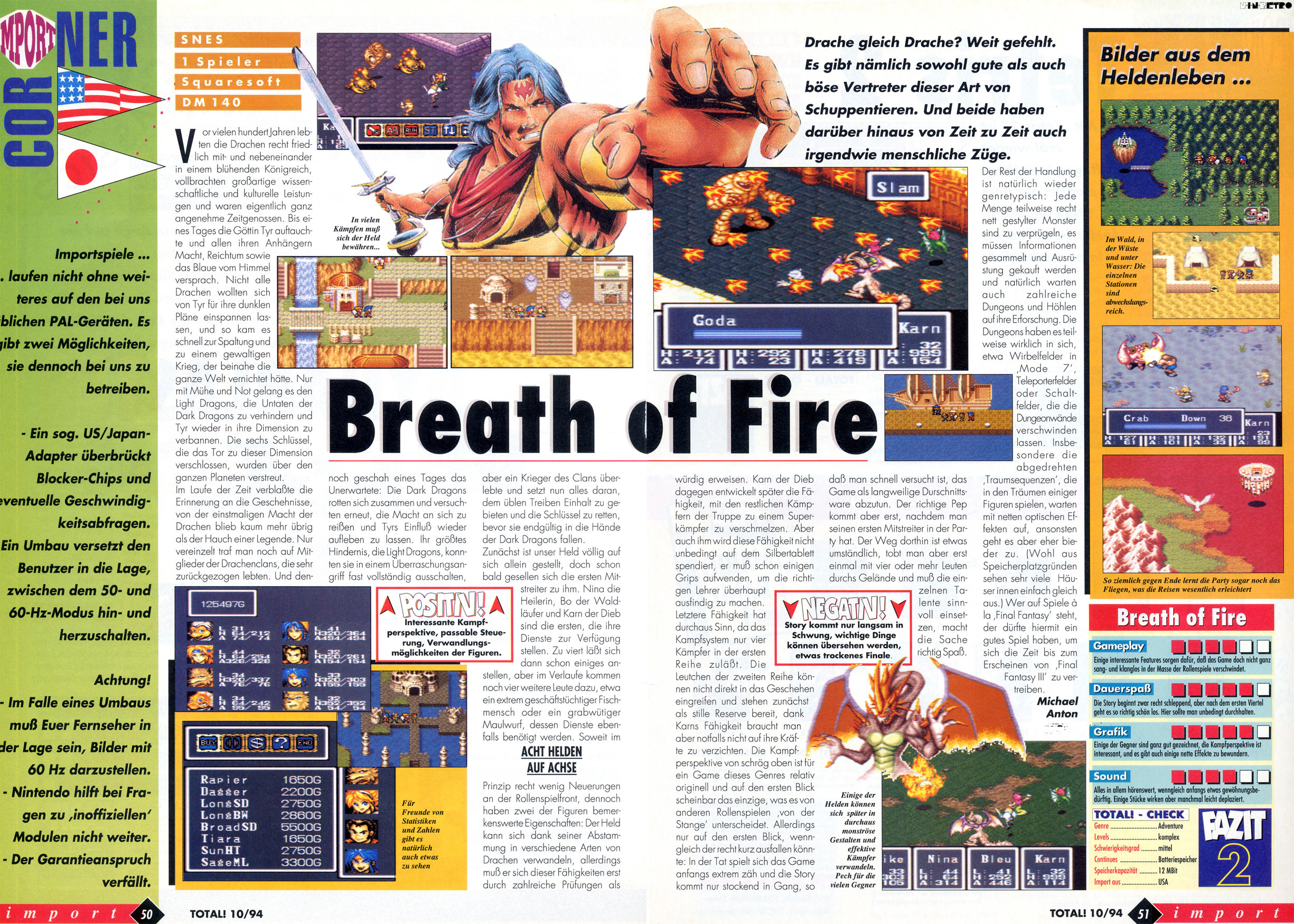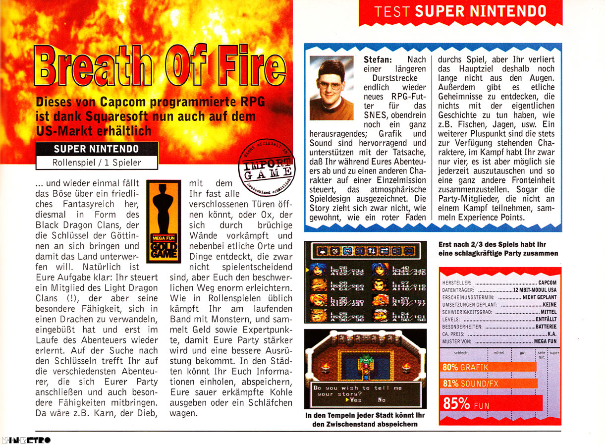 Man, man, man,... was hätte ich das Spiel früher gerne gespielt, vor allem nachdem ich Teil 2 hatte und es für mich seither zu den besten RPGs auf dem SNES zählt. Leider kam Teil 1 nie in Europa raus und mit Importen hatte ich damals nie etwas am Hut. Vor ein paar Jahren schaffte es das Spiel aber dennoch in meine Sammlung, zwar als GBA-Modul, dafür aber sogar komplett auf deutsch. Schade, dass BoF2 auch auf dem GBA nicht übersetzt wurde, nachdem dies auf dem SNES auch nicht geschehen ist. Hätte das Spiel sicher auch für mehrere Leute zugängier gemacht...