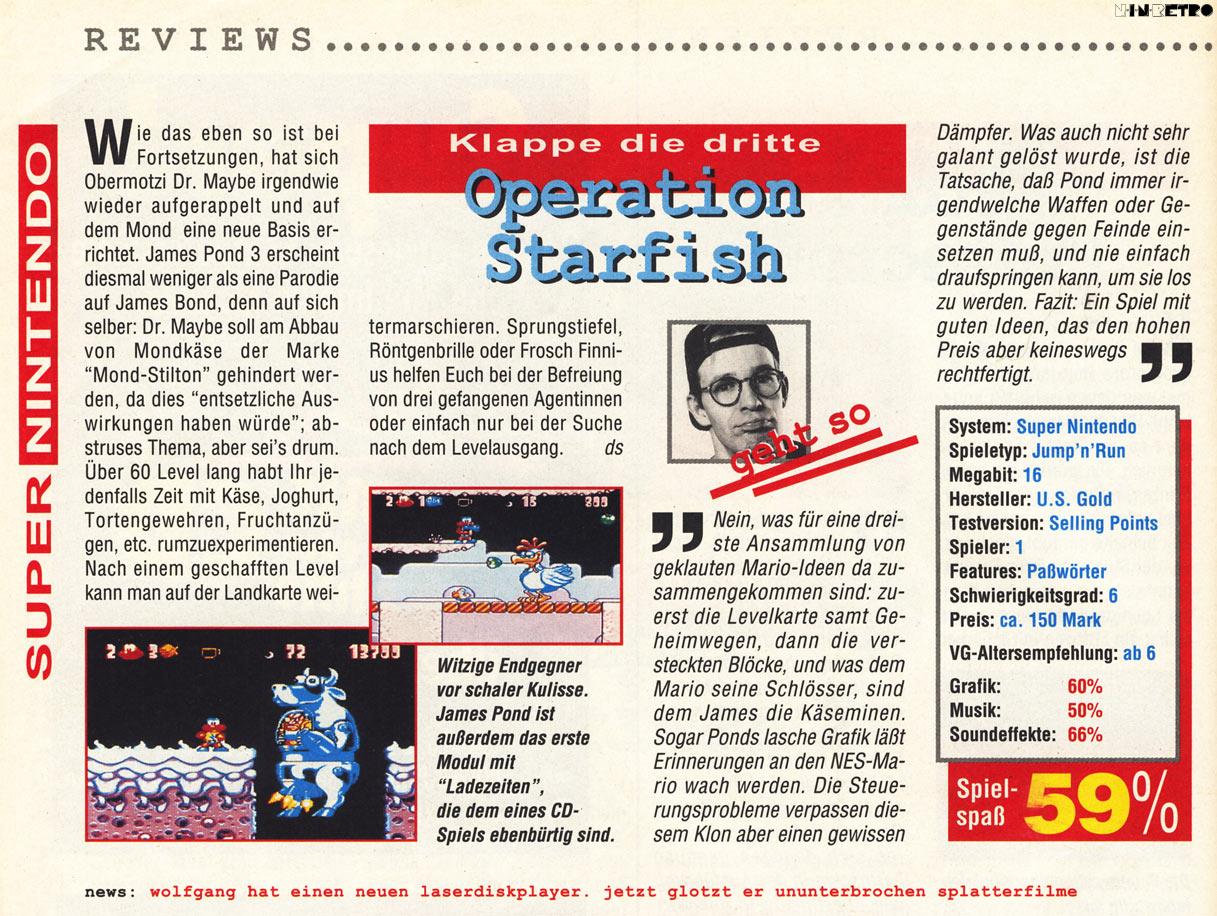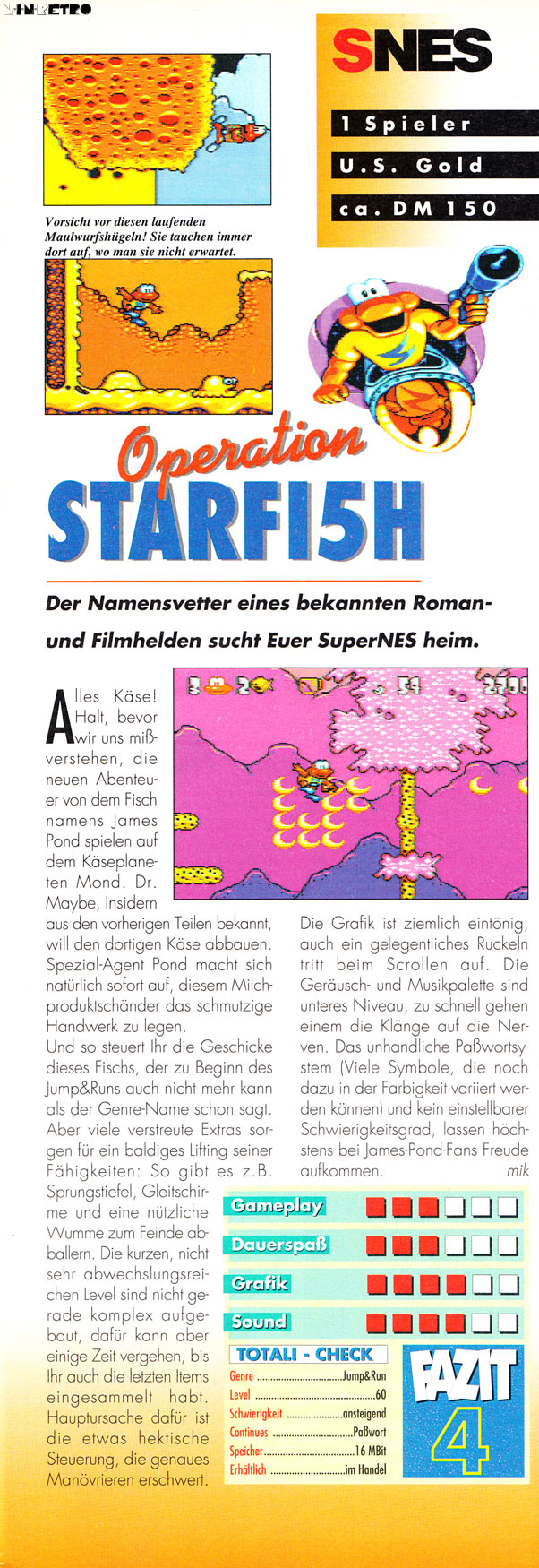Kein Auftrag ist ihm zu gefährlich, keine Gegend zu unwirtlich. Sein Name ist James Pond. Er ist der beste Geheimagent vom FI5H, ein Meister der Tarnung, der seine Gegner mit einem rauschenden Flossenschlag besiegen kann. James Pond beginnt gerade sein bisher gefährlichstes Abenteuer ... Operation Starfi5h. Viel Glück!