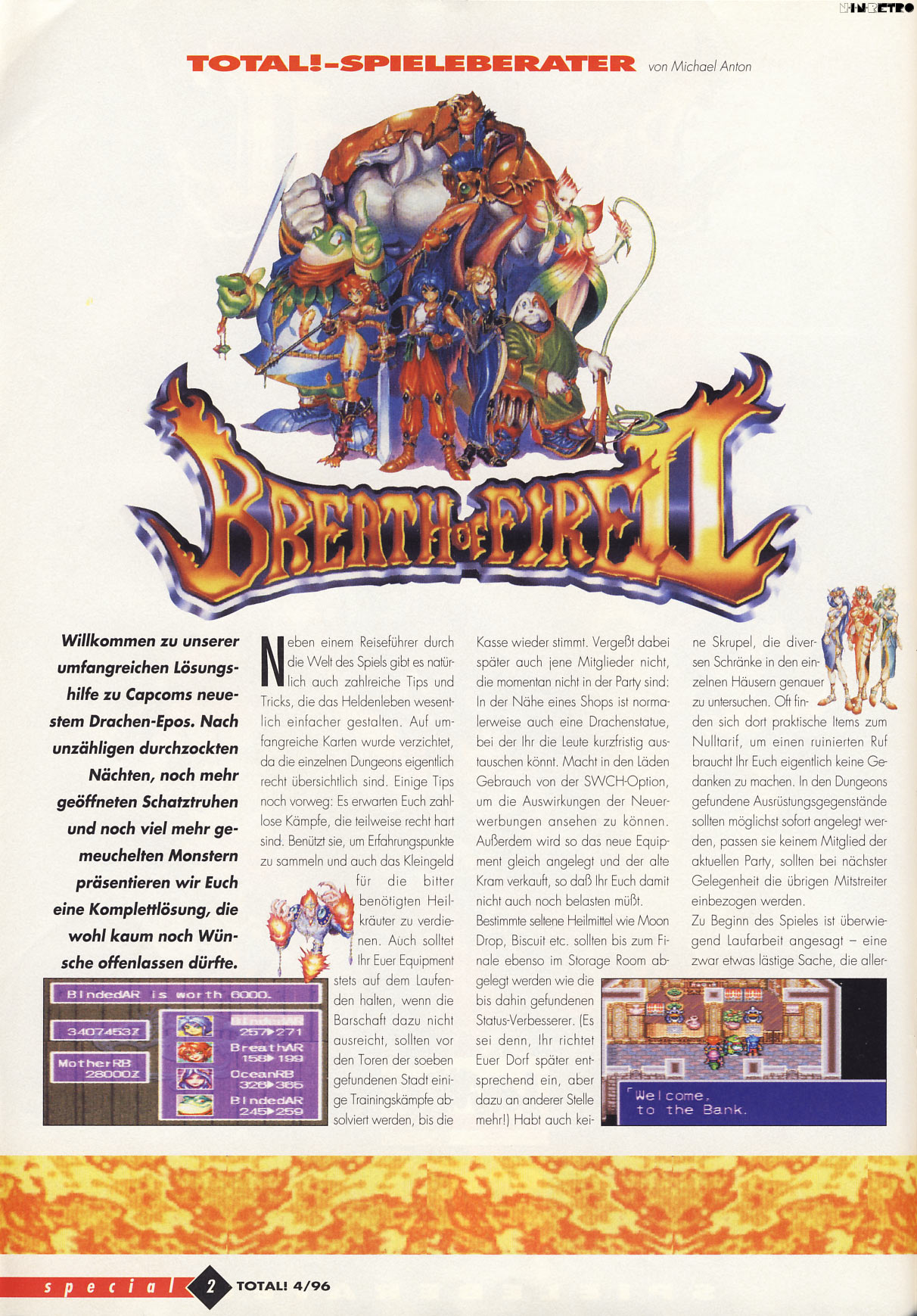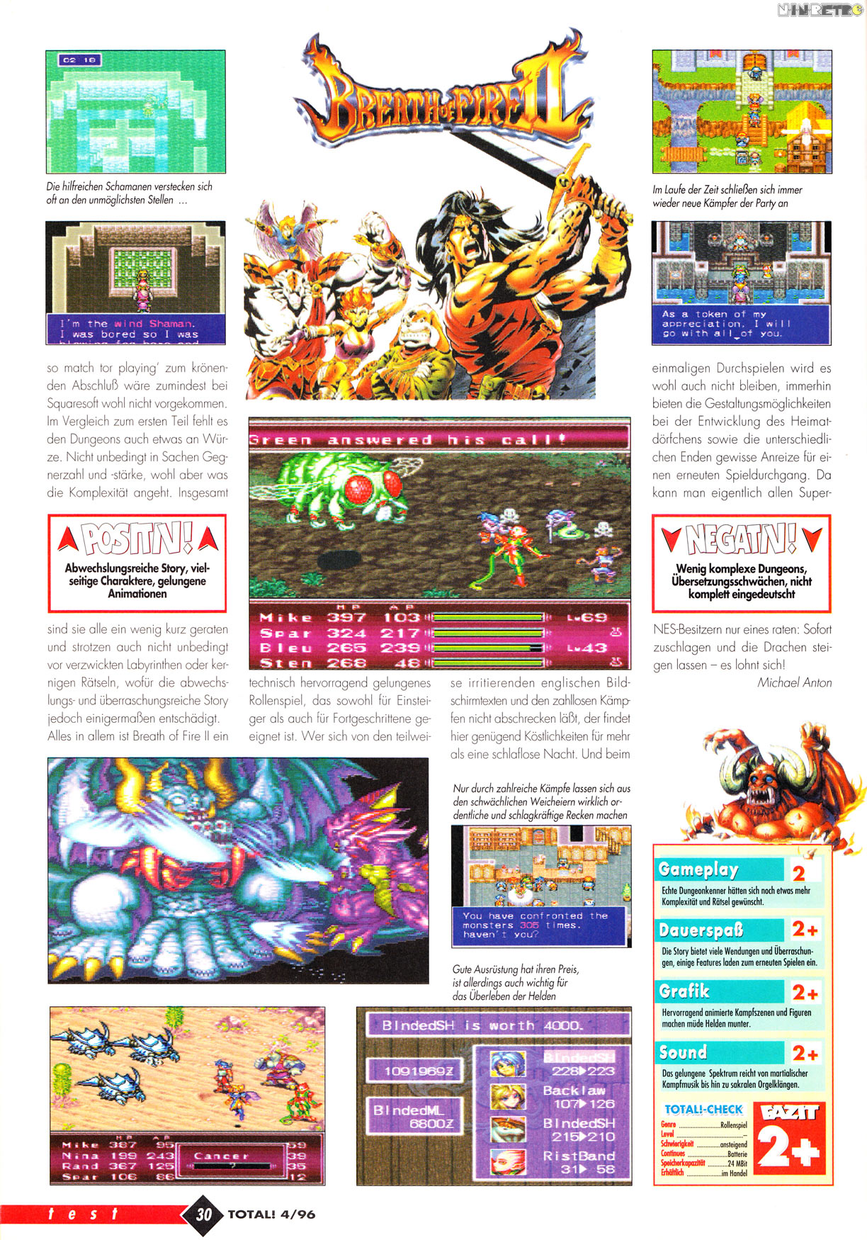 The incridible sequel to the best-selling RPG hit Breath of Fire is here! You are the last member of the Dragon Clan, fighting to rid the world of a growing evil. A cast of unusual and exciting companions joins you in your adventures across wonderous land filled with magic and mystery. You'll find strange mystic items, memorable monsters and exotic locations in your quest to conquer evil. There's strategy and spellcasting galore in the hours of compelling action and adventure that await you. Breath of Fire II is the ultimate in RPG excitement!