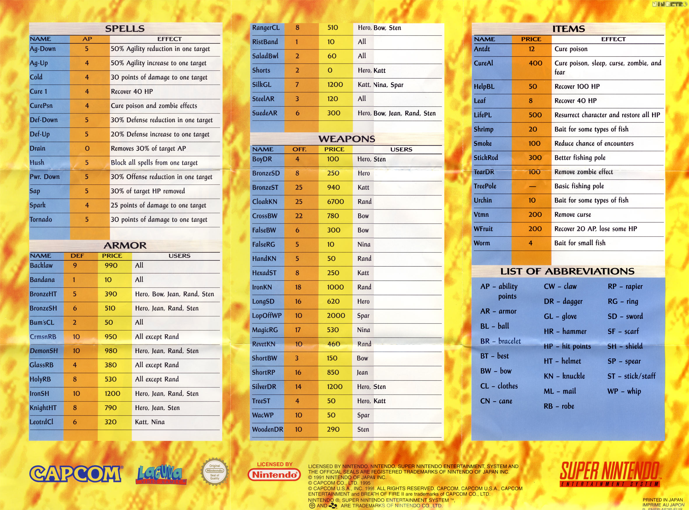 Als ich gestern Abend einige alte Spielepackungen nach bestimmten Werbeflyern durchstöbert habe, bin ich zufälligerweise auf eine Karte in der BoF2-Verpackung gestoßen. Wusste gar nicht mehr, dass da damals sowas dabei war. Auf einer Seite ist eine Übersicht der Weltkarte und auf der Anderen eine Liste der Items usw. Daher eingescannt, bearbeitet (war leider so groß, dass ich jede Seite nur in zwei Teile einscannen konnte) und jetzt online gestellt. Genau wie das Spiel, wurde auch diese Karte nicht ins Deutsche übersetzt, sondern lag auch in der dt. Verkaufsversion nur in engl. Sprache bei. Vielleicht ist sie ja für den Einen oder Anderen nützlich. :)