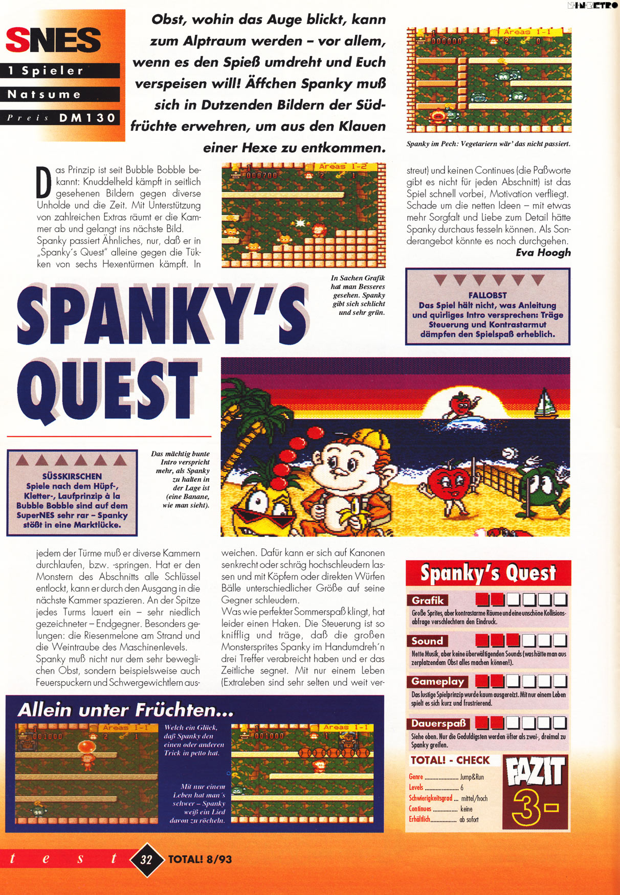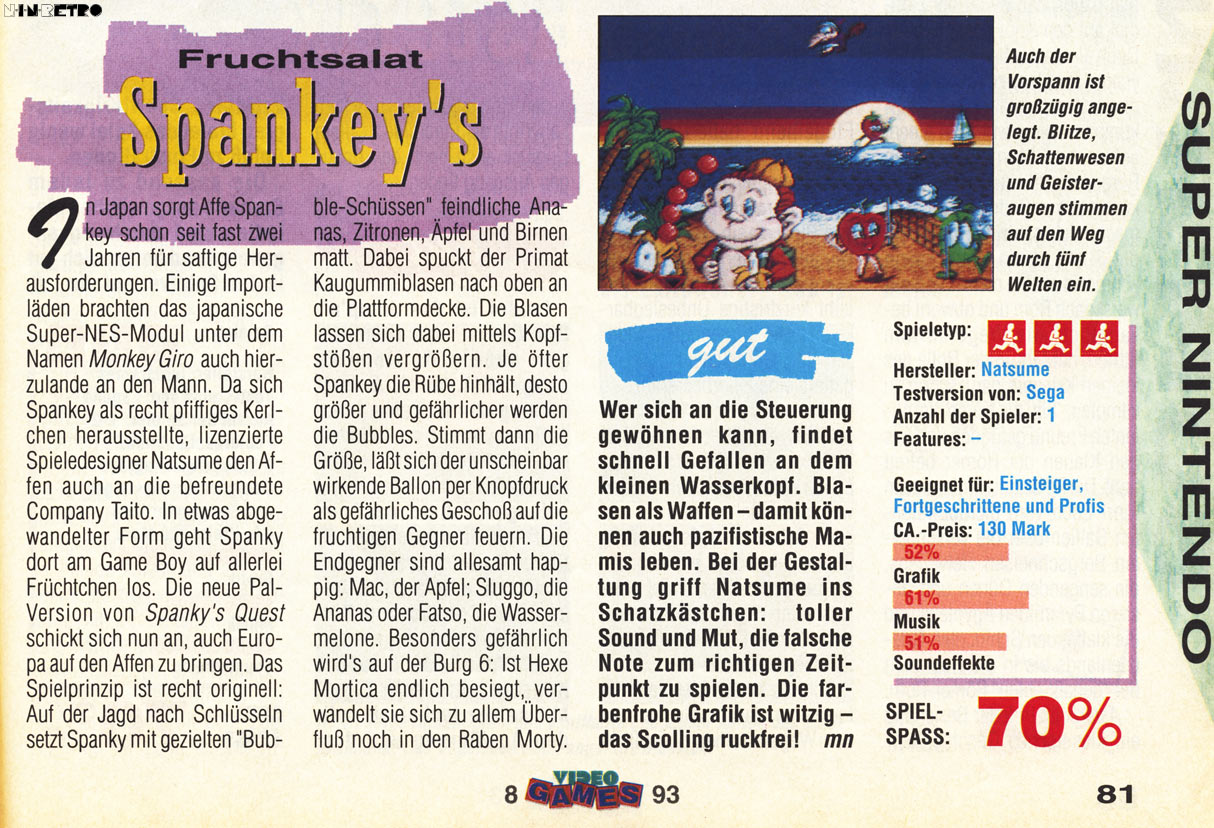 Eins muss man der US-Niederlassung von Natsume lassen: Humor hatte sie. Nannte den Affen Spanky und drückte ihm eine halb gepellte Banane in die Hand. Wer englische Redewendungen kennt, weiß Bescheid und darf sich fragen, wieso das Spiel in den prüden USA nicht einen Sturm der Entrüstung ausgelöst hat.