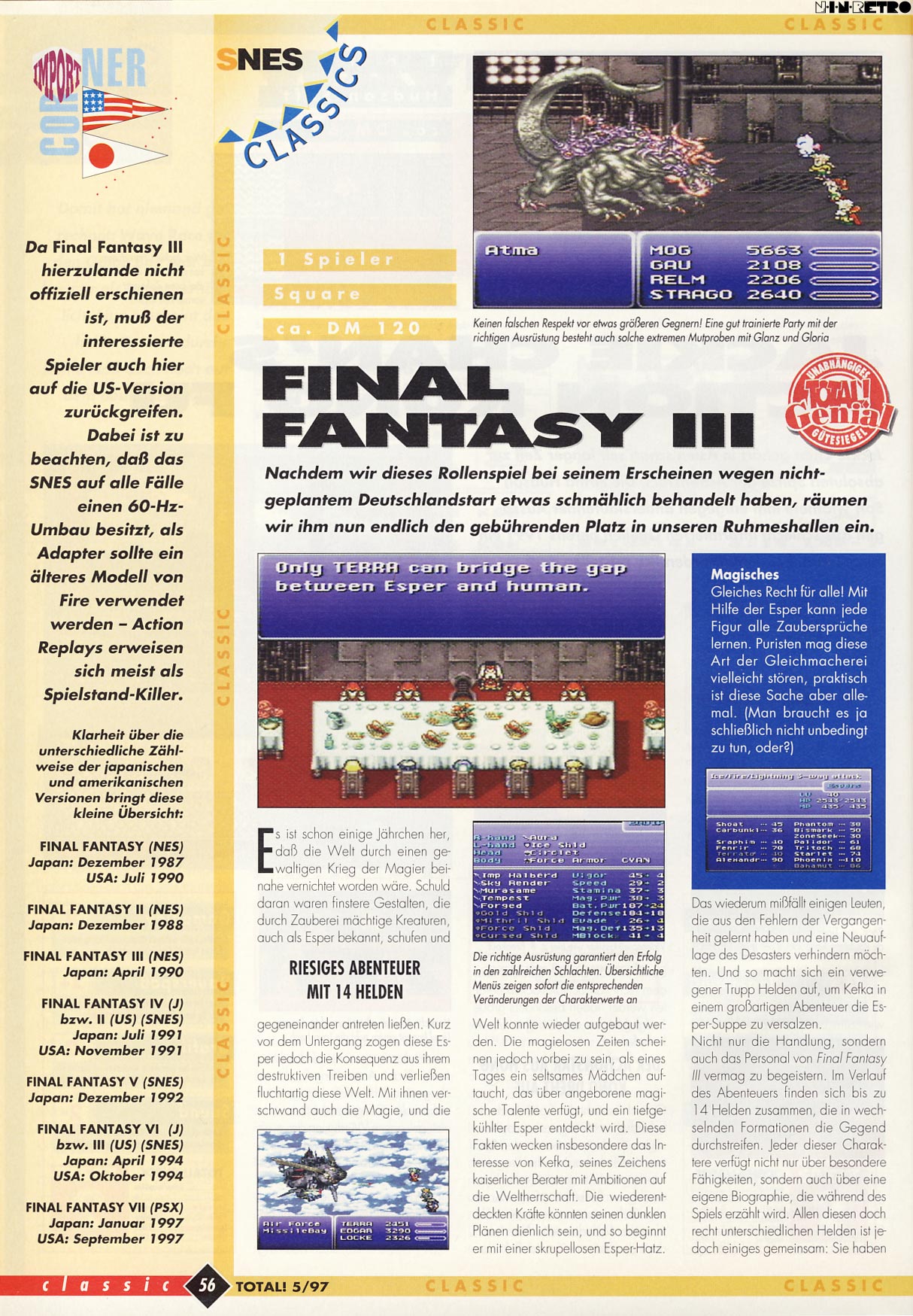 In den USA erschien "Final Fantasy VI" unter dem Namen "Final Fantasy III", da zuvor nur zwei Teile der Reihe dort veröffentlicht wurden.