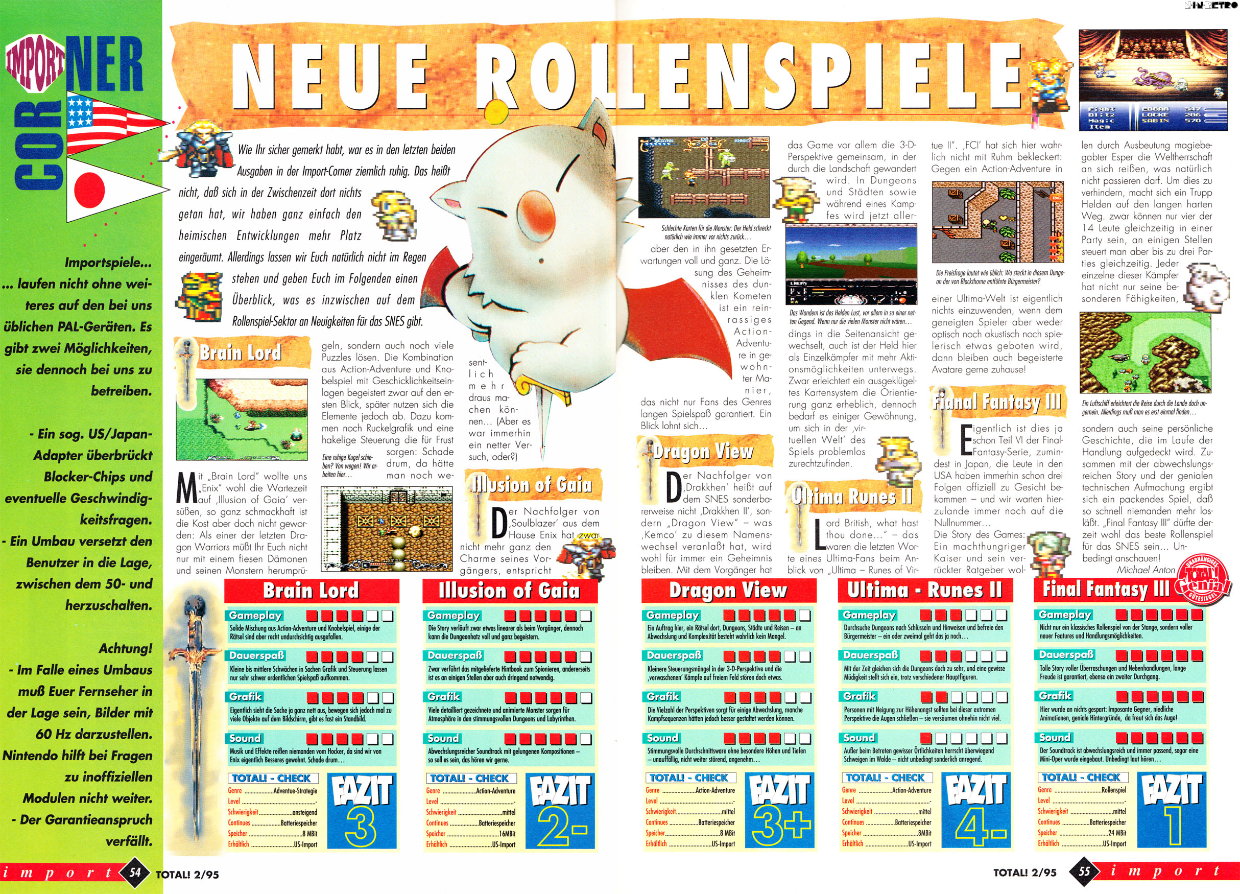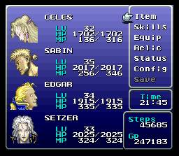 So also ich hab leider beide Versionen SNES wie GBA nur Emuliert gespielt weil die Preise echt horrierend sind und ich nicht weiß wie es um die Kompatiblität mit ausländischen GBA Modulen steht.Das Spiel selber ist echt wenns um die Welt und die Musik geht wundervoll, die story ist auch interessant und ich find Kefka als Bösewicht mit seiner ironischen Art doch besser als jetzt bei FF VIII oder Sephirot. Jetzt kommt aber mein großes aber und das bezieht sich auf die SNES Version die Encounter Rate ist genauso schlimm wie bei den Pokemon spielen was bei mir dann nur zu Brechreiz führt und die Speicherstände oder Punkte sind manchma so horrierend weit von einander weg dass ich manchma genervt war wenn ich nicht den richtige speicherpunkt zur richtigen zeit auch genutzt hab bestes Beispiel der erste Kampf mit Kefka ich denke in Narshe wo man seine Charakter wählen kann wer in den Kampf mitkommt etc. Das war sowas Dennoch ist echt ein schönes Game auch wenn ich Chrono Trigger besser finde was wahrscheinlich an der Musik und grade wegen Akira Toriyama Zeichenstil wobei er ja das Artwork gemacht hatte