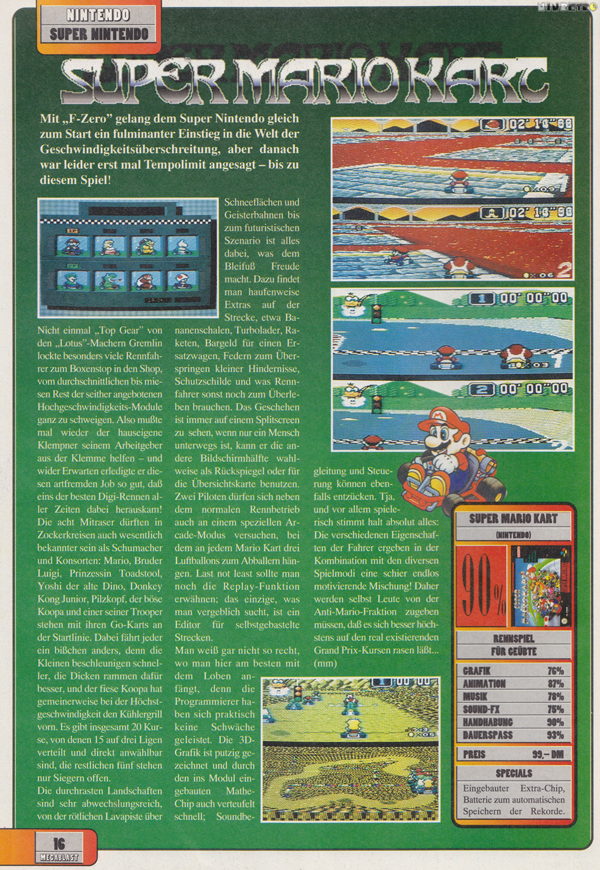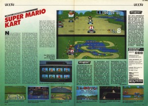 Also ich fand dieses Spiel immer etwas überbewertet, zwar sieht es auf den ersten Blick sehr schön und bunt aus aber die Strecken sind meistens viel zu klein ausgefallen. Wenn man dort für eine längere Zeit schafft die Höchstgeschwindigkeit beizubehalten ohne gegen eines der vielen lästigen Hindernisse zu stoßen, dann hat man manche von den Rennstrecken in teilweise in unter 12 Sekunden umrundet und das geht eigentlich gar nicht. Bei F-Zero beispielsweise braucht man für die kürzeste Strecke (Dead Wind 1) mindestens über 20 Sekunden und das obwohl man dort mit einem ziemlichen Affenzahn unterwegs ist. Für die längste Stecke hingegen (Fire Fild) braucht man locker fast 50 Sekunden für eine Umrundung und 5 Minuten bis das gesamte Rennen auf der Etappe vorbei ist. Bei Mario Kart dagegen nur einen Bruchteil. Zudem fahren die Fahrzeuge hier recht instabil und es ist mehr ein gerutschte als ein gefahre. Nebenbei ist auch die Hintergrundgrafik sehr grieselig was bei F-Zero besser gelöst war und auch der Bildausschnitt ist bei Mariokart irgendwie zu schmal. Positiv dagegen ist vielmehr der Zweispielerdmodus, das ist wirklich eine Bereicherung, besonders dort wo man sich gegenseitig die Ballons abschießen muss. Allerdings bin ich nicht sehr häufig in den Genuss dieser Funktion gekommen da ich keinen zweiten Controller hatte und die Freunde damals noch ärmer gewesen sind und deren Eltern nicht bereit gewesen sind ihnen so etwas teures wie ein Super Nintendo zu kaufen.