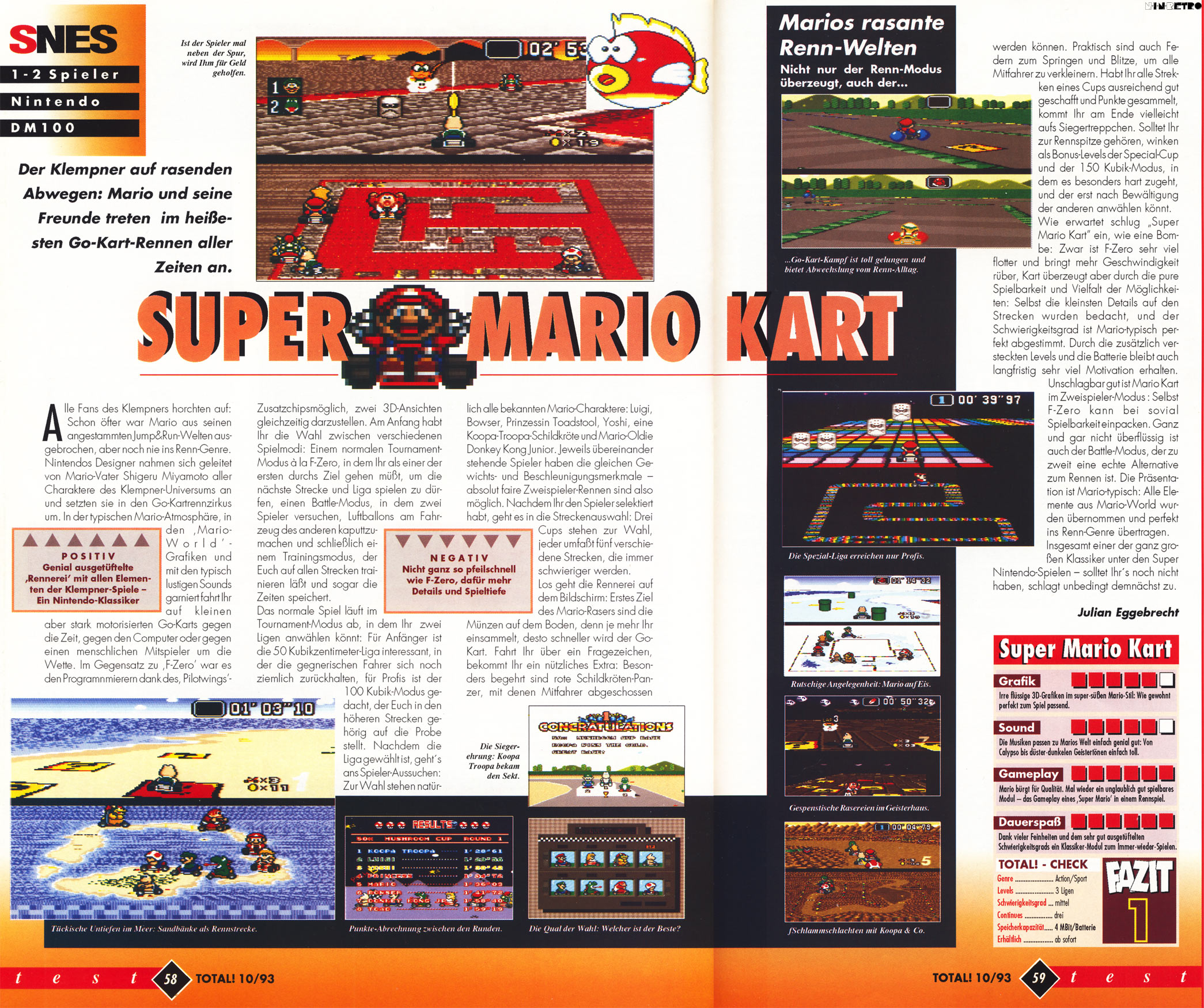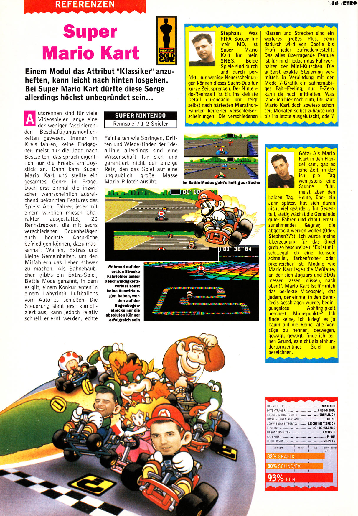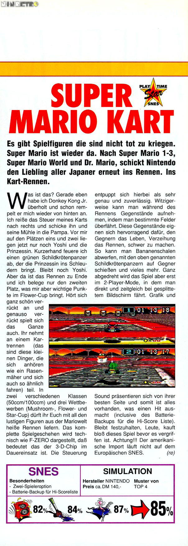 Absolut geiler Racer, auch heute noch. Ein richtiger Geniestreich und Meisterwerk. Perfekte Steuerung und ist im Singleplayer im Gegensatz zu allen anderen Mario Kart Spielen auch richtig fordernd. Multiplayer auch immer noch eine Spaßkanone. Alle Wertungen unter 90% sind inakzeptabel