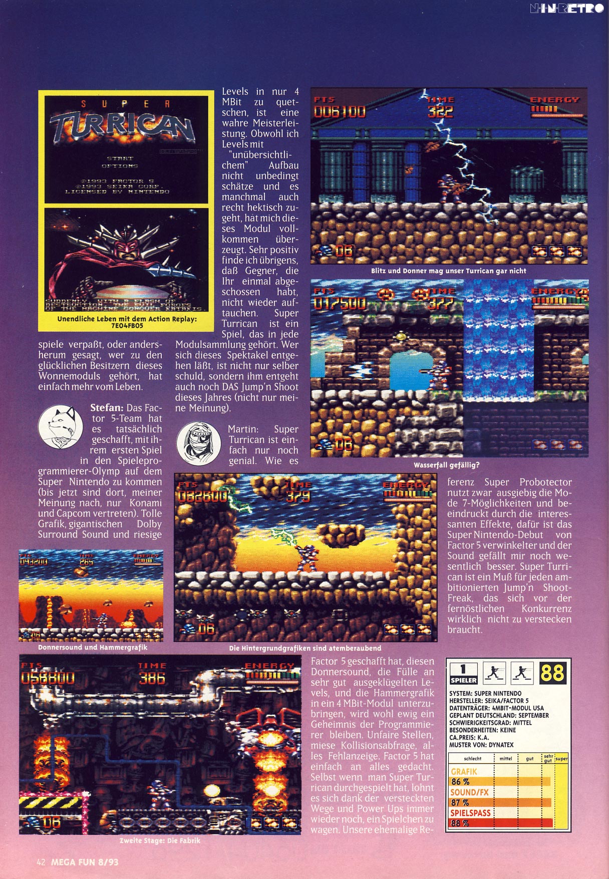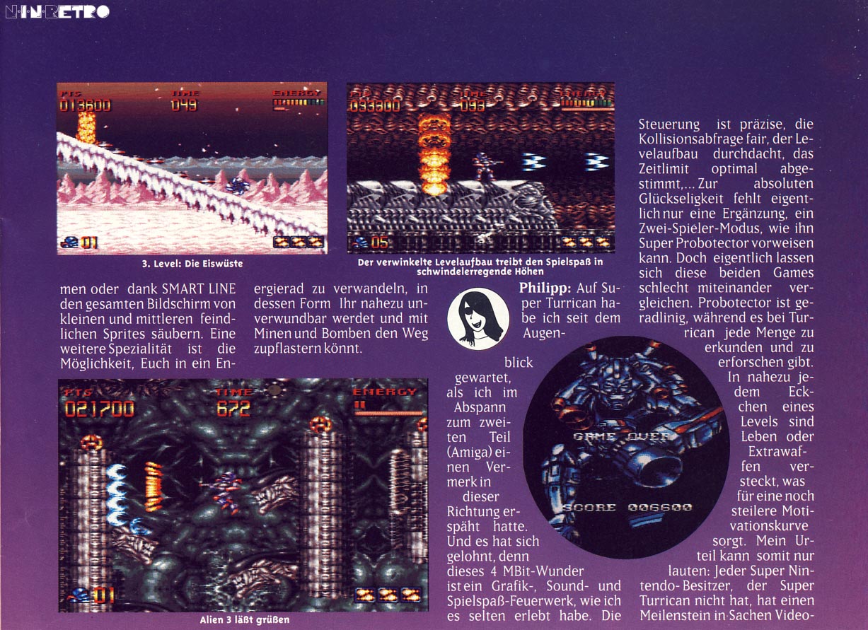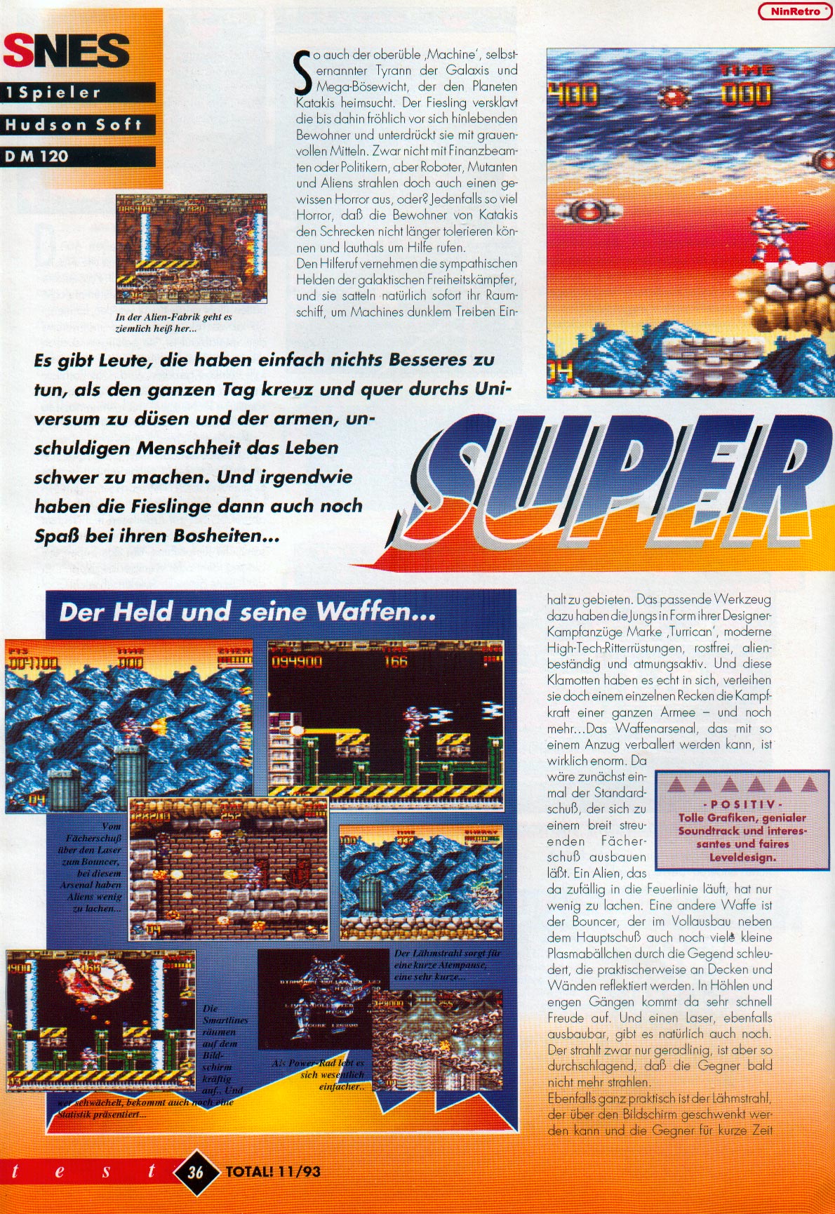 Ein gut konvertiertes Amiga-Ballerspiel. Kommt vom Spielgefühl in meinen Augen aber nicht ganz an Super Probotector ran. Dafür sind die Extrawaffen interessant und es gibt auch einige Geheimräume zu entdecken. Für ein 4MBit-Spiel technisch und soundmäßig auf jeden Fall klasse, was Factor 5 aus dem SNES rausgekitzelt haben!