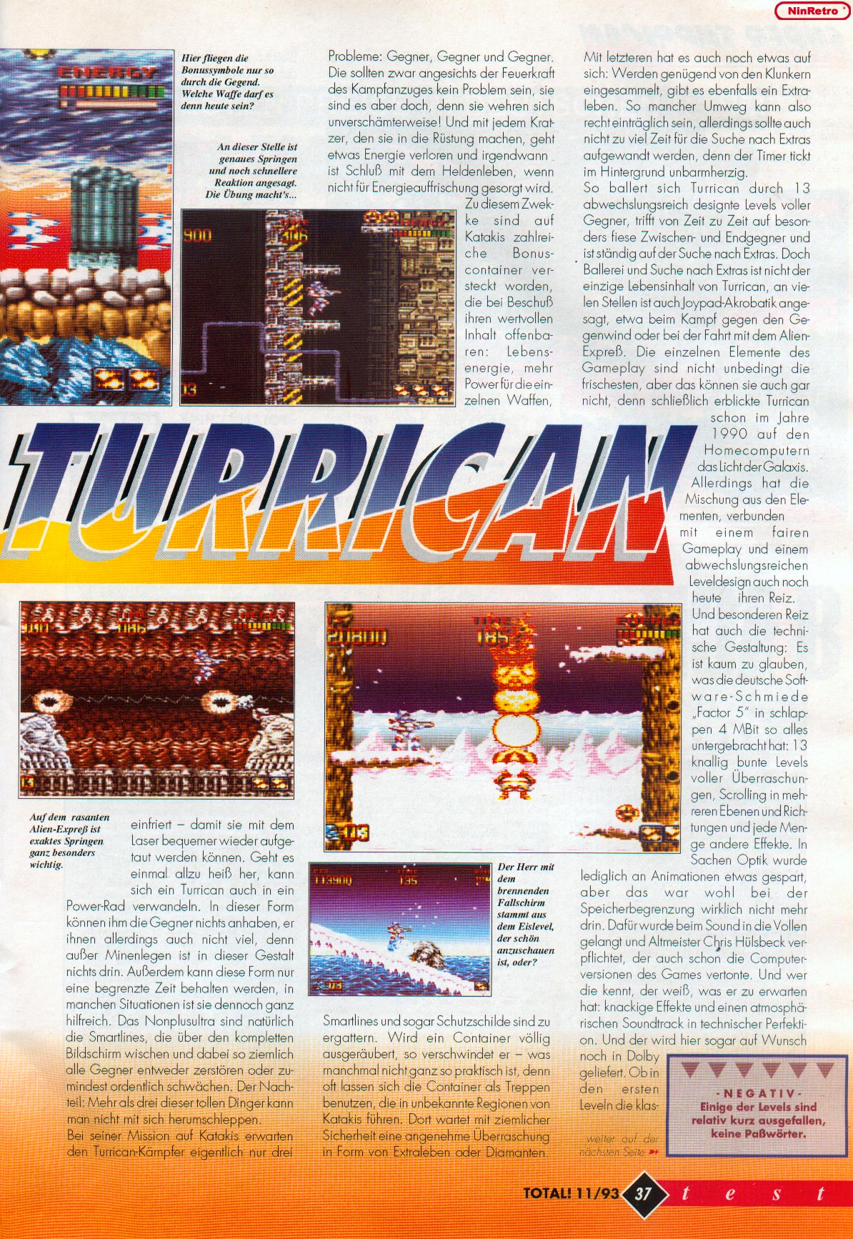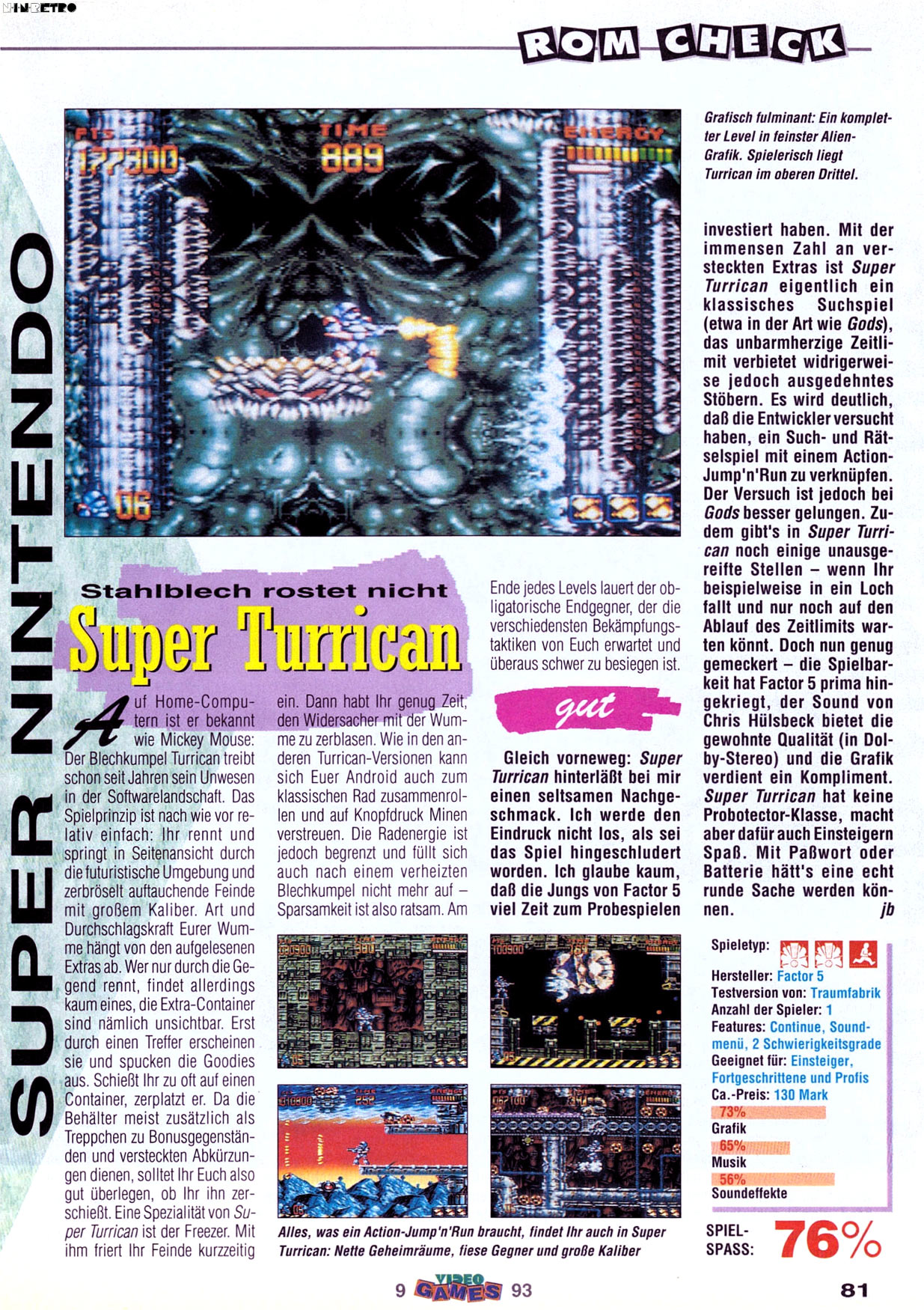 Eigentlich ist Super Turrican ganz gut, aber ich fand das Spiel irgendwie nie so ganz ausgewogen. Zig verstreute Extras, von denen auch die Hälfte gereicht hätte, stellenweise etwas seltsames Leveldesign und die Sprungpassagen/Geschicklichkeitsabschnitte (Stichwort Alien-Zug ) sind aus meiner Sicht nur bedingt gelungen. Technisch klasse, sonst solide.