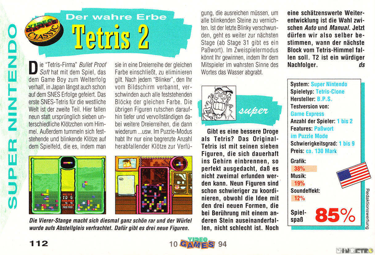 Tetris 2 fehlt die Leichtigkeit des Gameplays, die Einfachheit des Spielprinzips. So ist es oft nur Zufall, wie man zum Erfolg kommt. Trotzdem: Es gewisses Suchtprinzip eröffnet sich auch beim zweiten Tetris-Teil. Wer diese Spiel, sollte mal rein schauen. Teuer ist das Spiel nicht.