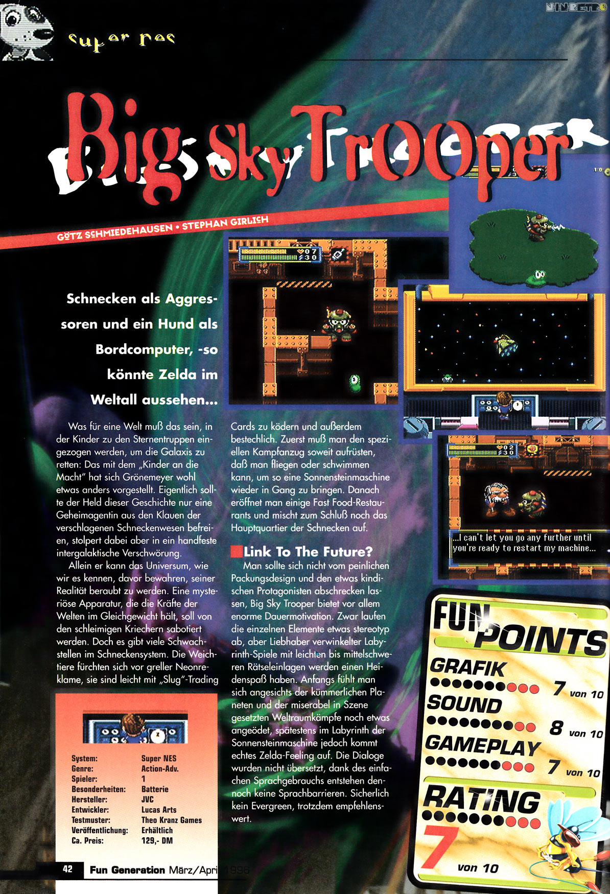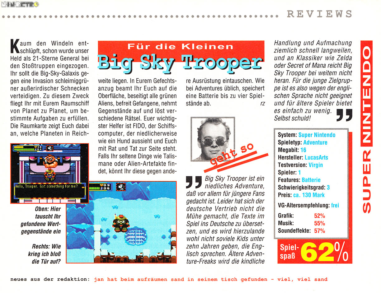 Ich habe es mal so ein bis zwei Stunden angespielt, es hat mich aber nicht gepackt. Alles ist etwas sehr simpel gehalten, das Spiel richtet sich offensichtlich an ein recht junges Publikum. Von der technischen Seite ist Big Sky Trooper ok, wenn auch unspektakulär.