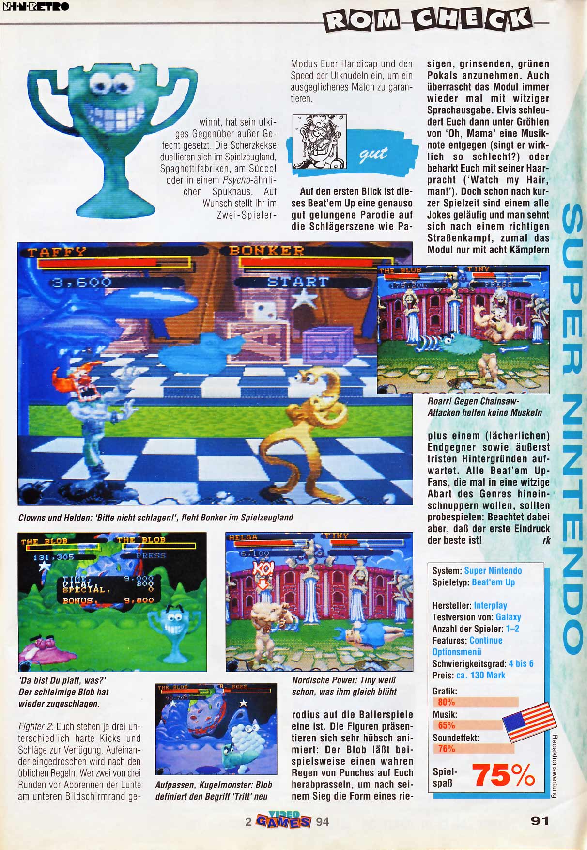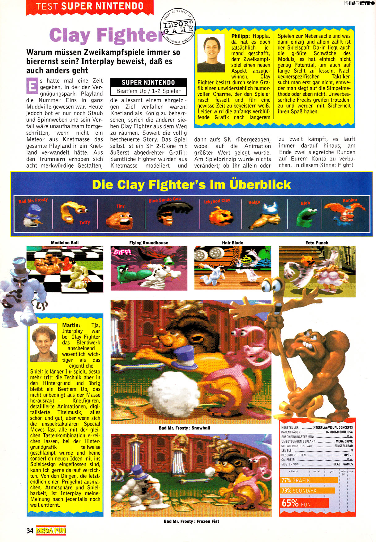 Das Spiel habe ich mir damals in der "Grabbeltisch-Phase", als hier in der Gegend plötzlich öfter mal Spiele billig abverkauft wurden (muss wohl zum Ende der SNES-Ära gewesen sein oder so), für ca. 50,- DM mitgenommen. Teil 2 hatte ich zu dem Zeitpunkt schon länger in meiner Sammlung und ich muss sagen, dass mit das erste ClayFighter leider nie so wirklich begeistern konnte. Na ja, Teil 3 habe ich mir deshalb für das N64 erst gar nicht gekauft. Bei der Reihe ist es imo überhaupt so, wenn der Spielwitz mal verflogen ist, wird's langweilig.