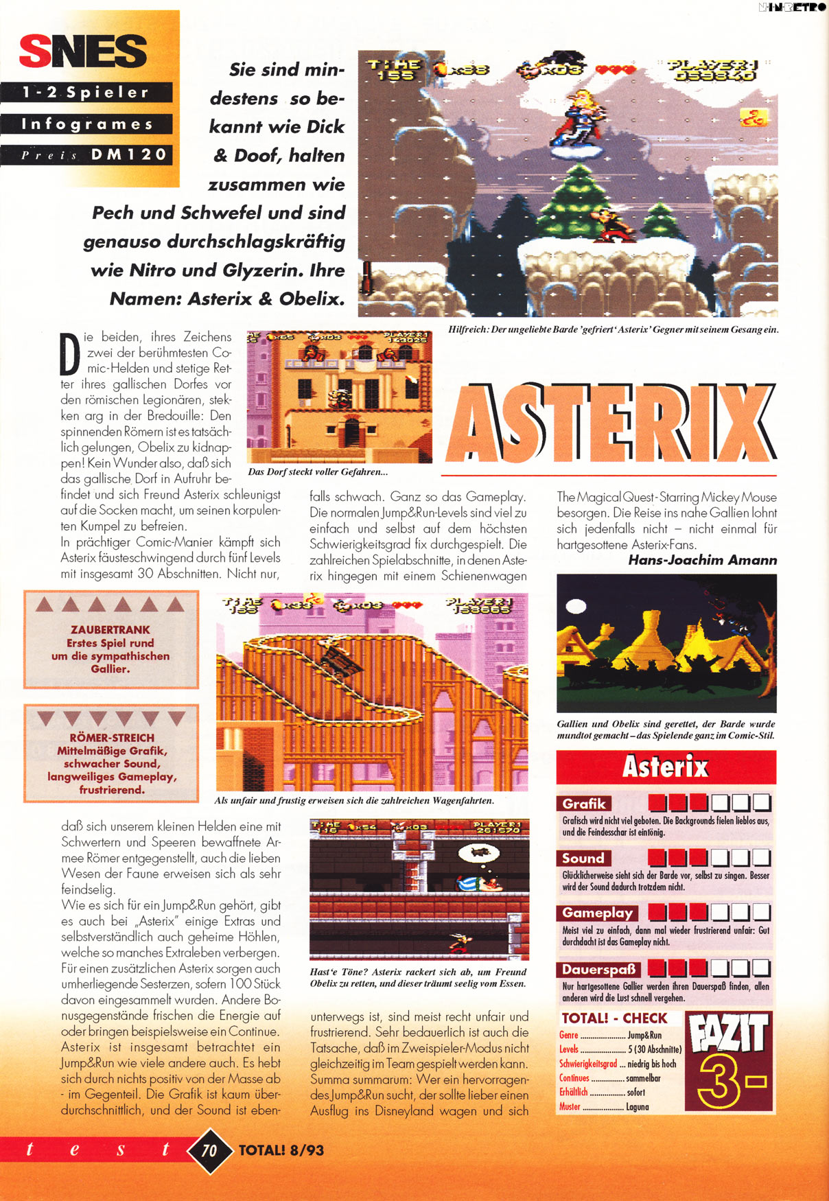 Mit Emulator hielt sich der Frust in Grenzen und Asterix, der Gallier konnte seinen Spaß entfalten, wenn auch nichts Außergewöhnliches geboten wird. Ansonsten wäre das Modul wohl nach wwenigen Minuten in der Ecke gelandet. Man zeige mir das Kind, welches dieses Spiel am Stück und ohne mit der Wimper zu zucken durchspielt. Ein großer Becher Eis ist diesem Kind gewiss. Mit Sahne! Und einer Kirsche oben drauf!