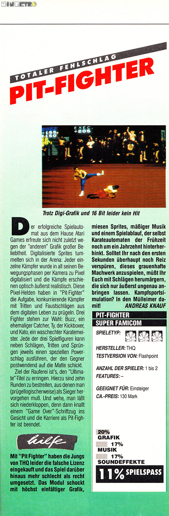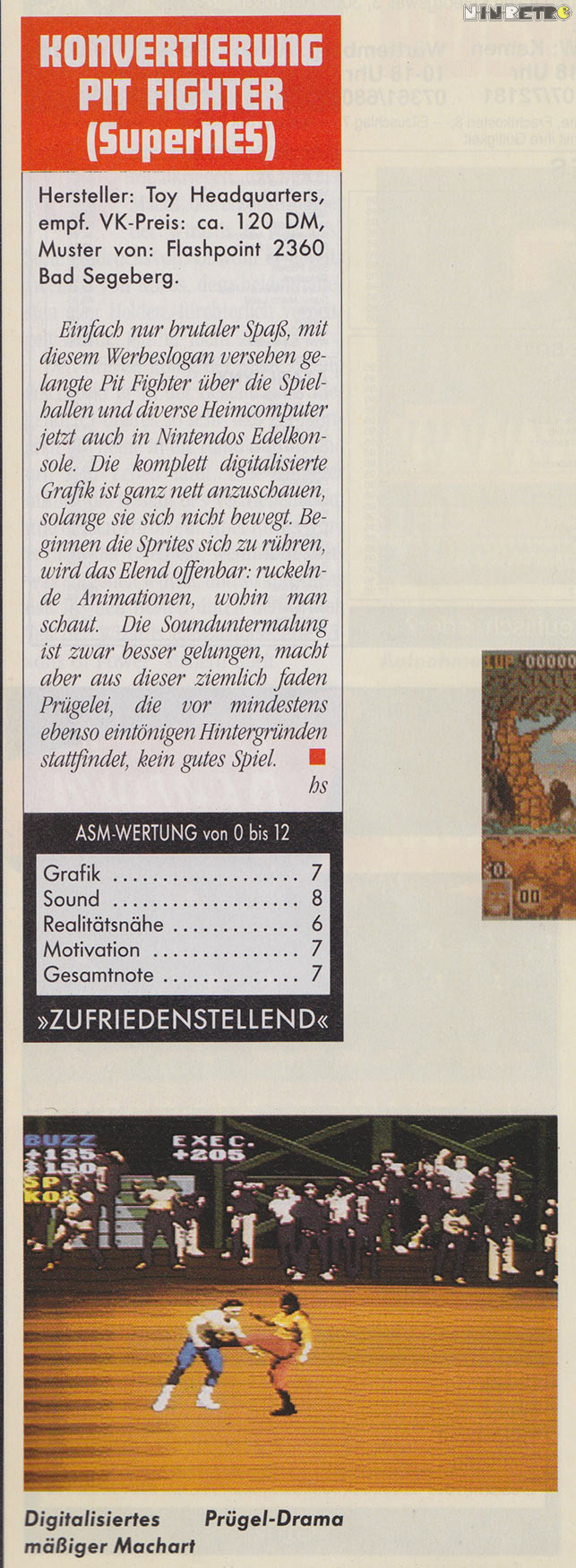 Als ich den neu hochgeladenen ASM-Test gesehen hab, hatte ich den Verdacht, dass die Test-Supermänner Pit-Fighter bestimmt fast gleichauf mit Street Fighter II sehen. Und, oh Wunder, Street Fighter II, kam mit ner 8 davon, Pit-Fighter bekommt 7.