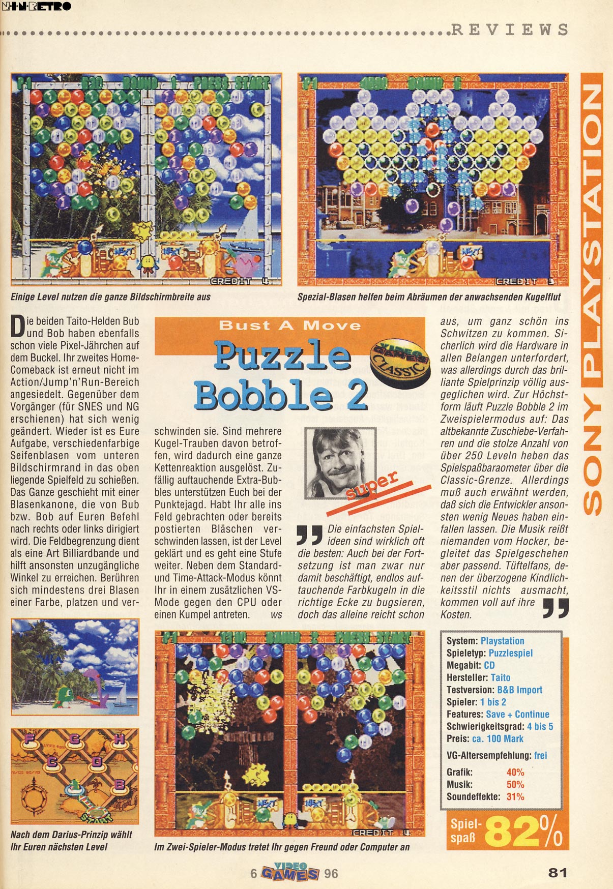BUST-A-MOVE 2 is the lightning-quick, ultra-intense, 100% addictive, arcade puzzler that's gonna grab you and never let go! As the balls descend, you're gonna need sharp eyes and quick reflexes to match 3 or more balls and pop them... fast! Insane two-player action pits you against an opponent in a race to bust or be busted!!
