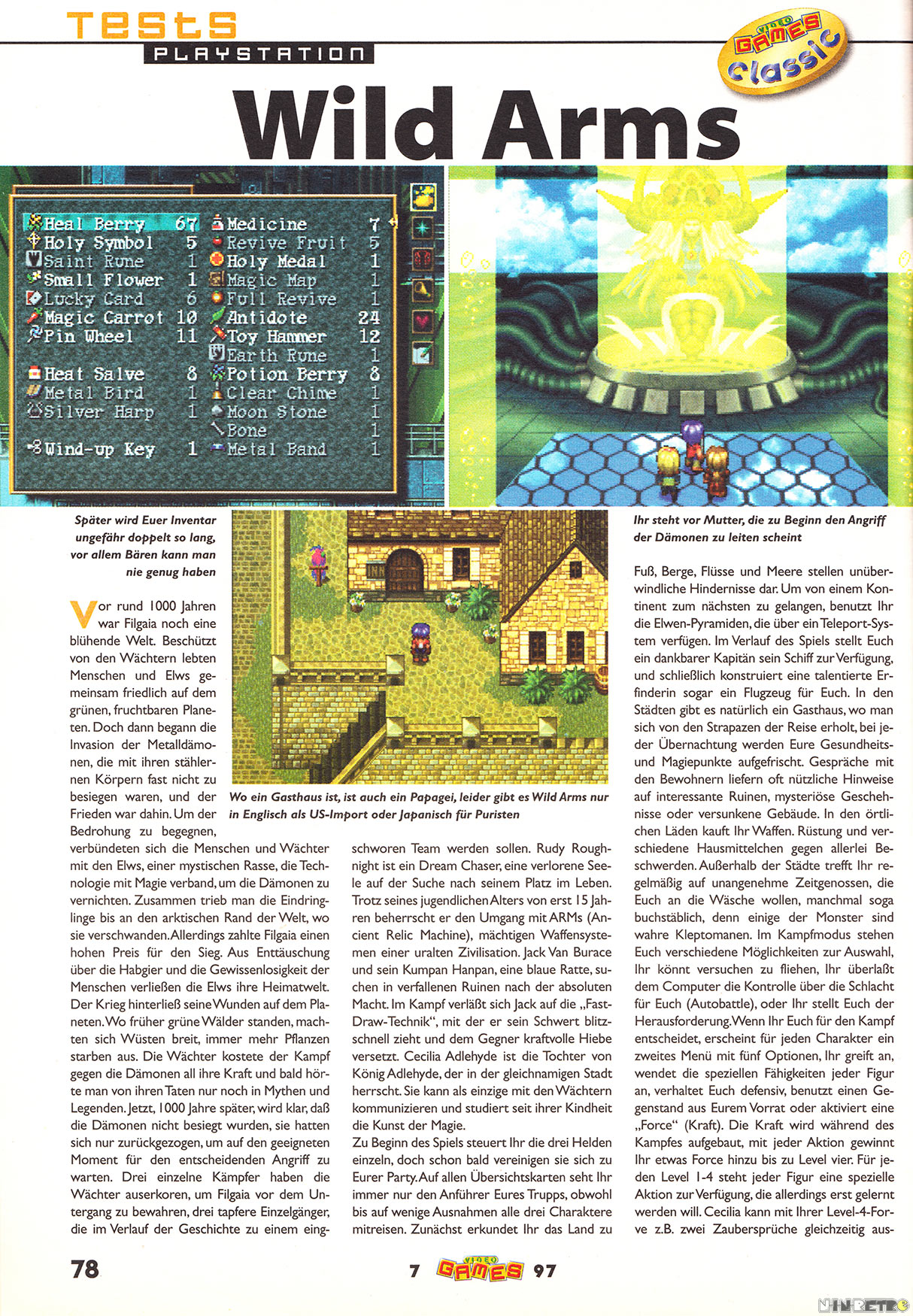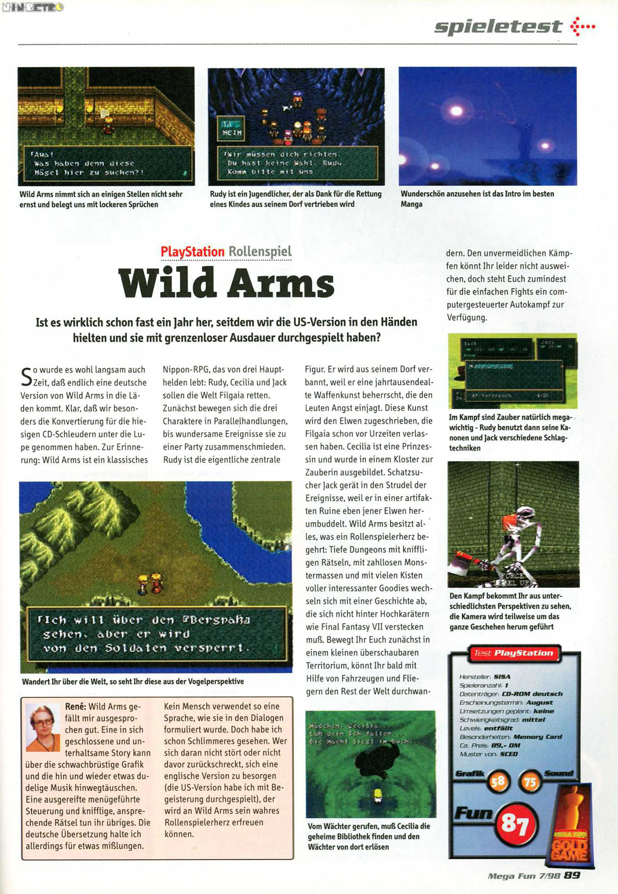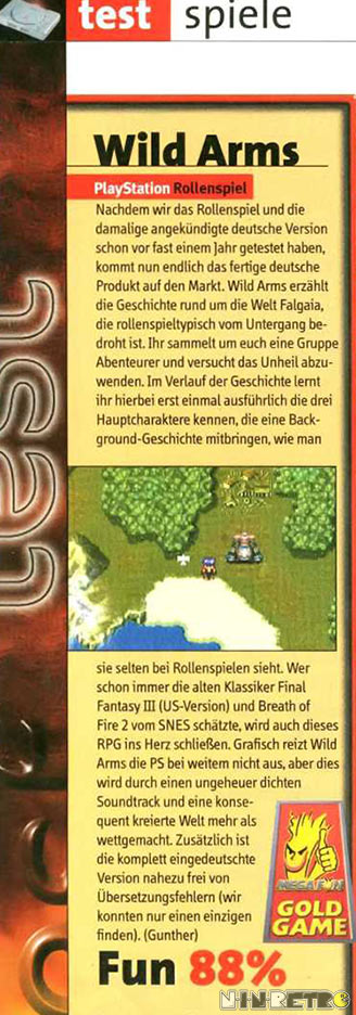 Ein wirklich tolles Spiel. Am meisten ist mir das Intro in Erinnerung geblieben. Sauber animiert und cooler Sound. Die Story hat mir sehr gefallen. Problematisch fand ich die damals schon schlechte Technik. Das ist natürlich dem frühen Release anzulasten. Aber die 3D-Kämpfe sehen wirklich fürchterlich aus. Ich bin eindeutig SNES-verwöhnt. Ich habe lieber eine schöne und sauber animierte 2D-Umgebung in den Kämpfen, als dieses Pseudo-3D mit seinen abgehackten Bildern. Schlimm...jaja. Nun ist es aber die eingängige Geschichte die RPG´s eben spielenswert machen. Und daher muß man Wild Arms einfach empfehlen.