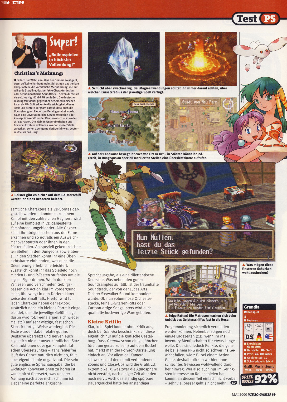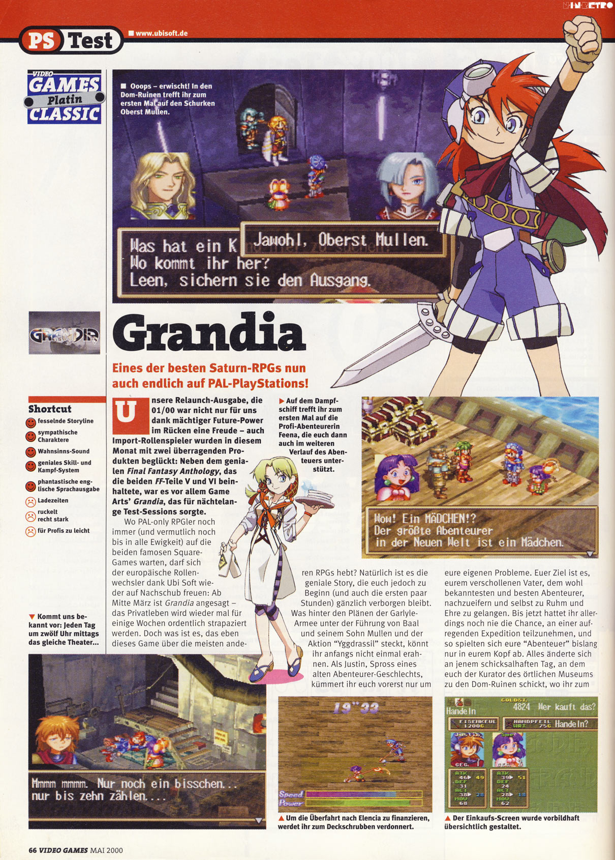 Die Kämpfe waren auch in vielen Fällen herausfordernd (besonders bei Endbosse) und können einiges an Strategie vom Spieler abverlangen. Die Übersetzung grenzt fast noch weg zusehen, macht das Spiel jedoch umso humorvoller. Wer auf der Suche nach einem guten, alten RPG ist und sehen will, wie schlecht und gleichzeitig witzig deutsche Sprachausgaben (auf PSOne) sein können, der soll sich Grandia definitiv mal angespielt haben unter RPGs-Fans!