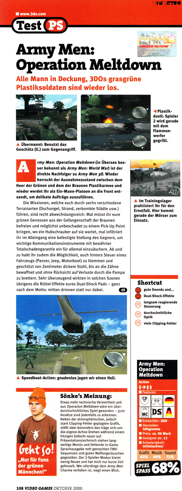 The next chapter in the bestselling Army Men series, Operation Meltdown immerses the player in a battlefield experience with a wider variety of interactive terrain than ever before, and even more objects to hide behind, incinerate and blow to smithereens. There is also a vastly, improved 2-player mode allowing players to set up more effective defensive strategies as well as the addition of cooperative mission-based levels.