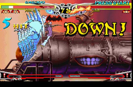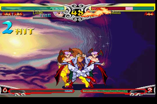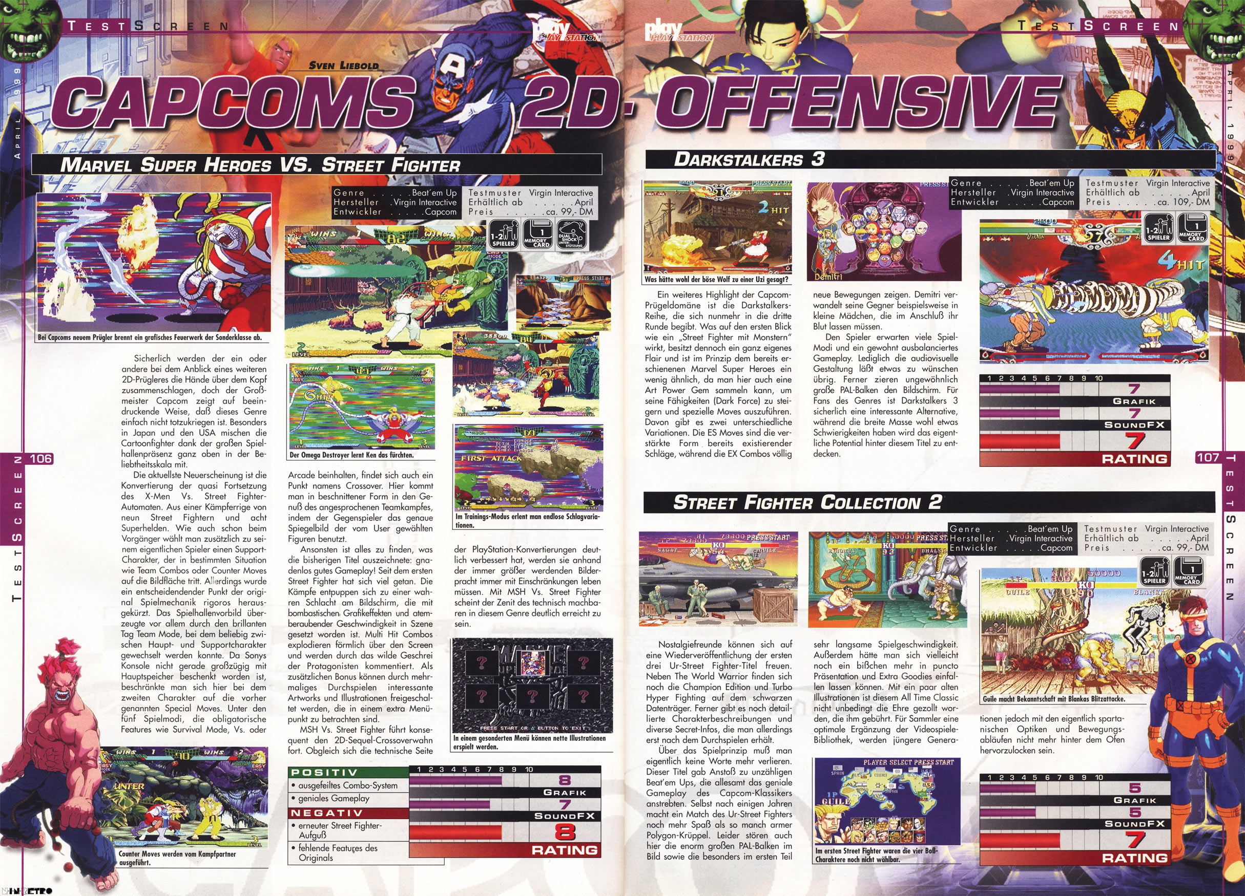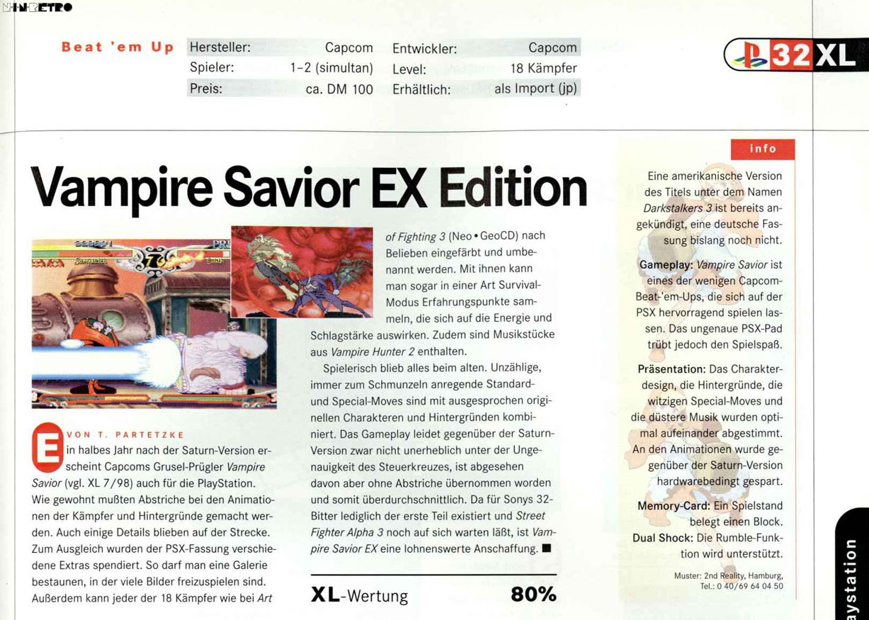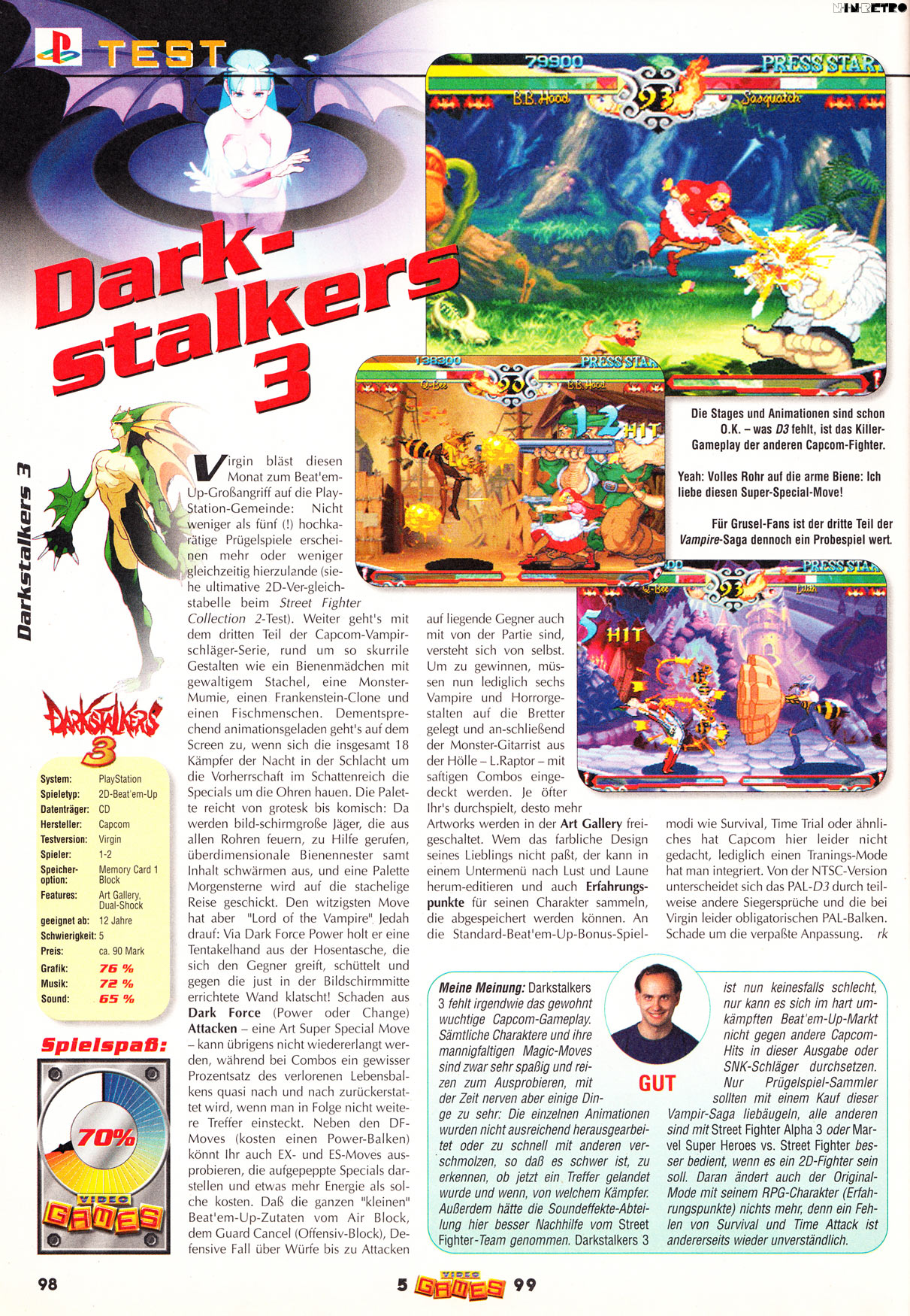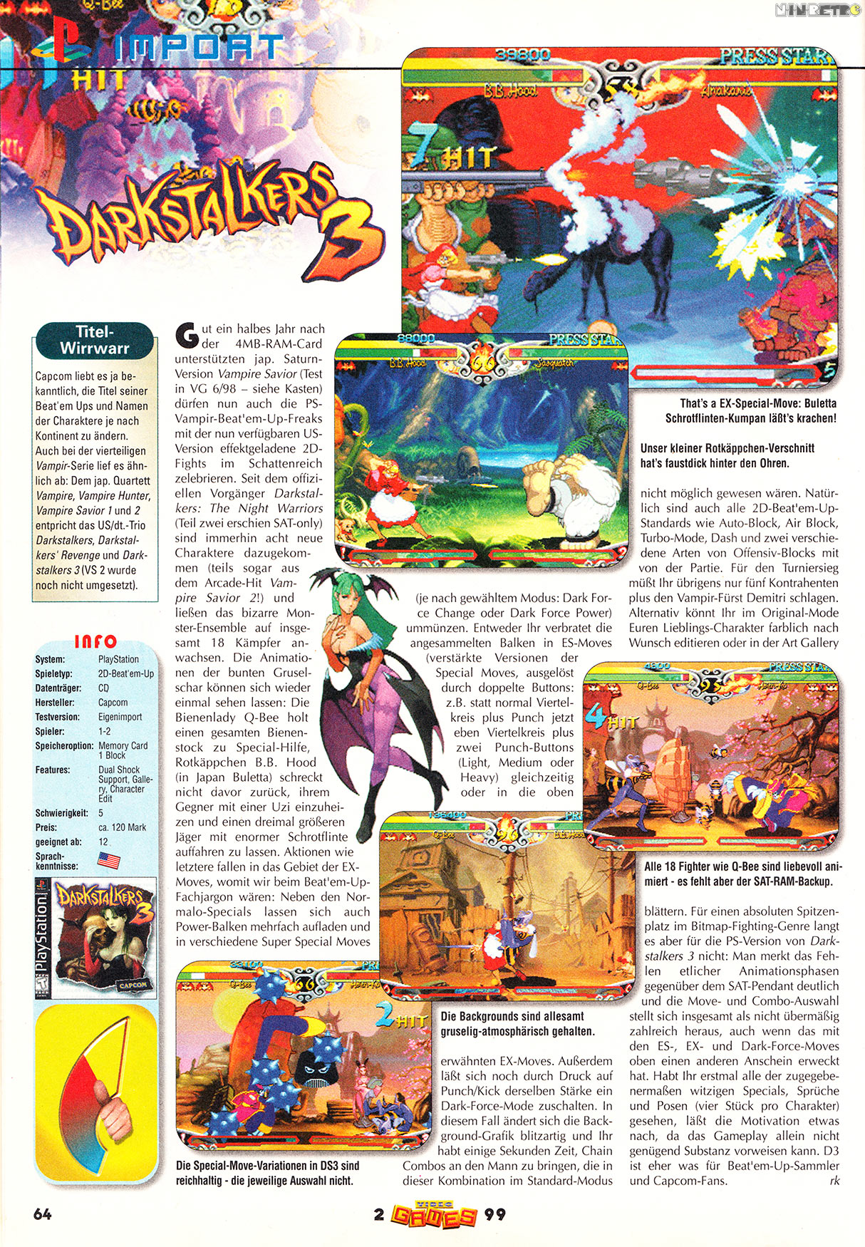 Darkstalkers ist nichts anderes als Street Fighter mit anderem Setting. Die Engine ist die gleiche wie bei SF2. Warum ist also die Bewertung der Magazine so niedrig? Mir gefällt Teil 3 sehr gut. Die Musik ist nicht so passend wie beim Original SF2, aber ansonsten kann ich nicht meckern. Die Stages sind passend zu den Figuren gut gezeichnet (auch wenn sie nicht so toll animiert sind), die Figuren sind recht kreativ umgesetzt und auch zahlreich vorhanden, die Movelist ist in Ordnung und das Spiel ist SF-mäßig flink und hat eine gute Kollisionsabfrage. Und vor allem Morrigan die Geisterkönigin *lechtz*. Unterm Strich finde ich den Street Fighter-Klon aus eigenem Hause gelungen und wird einen 2D-Fighting-Fan auch nicht enttäuschen.