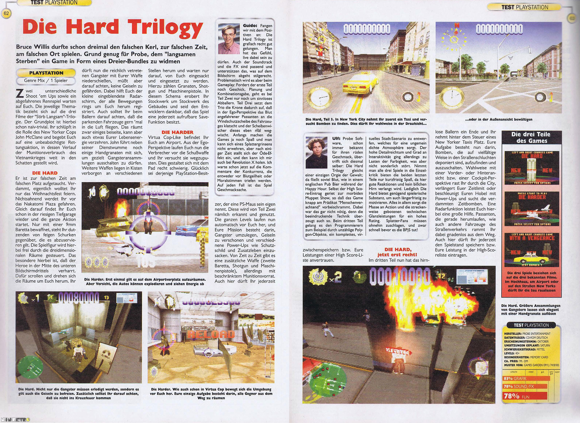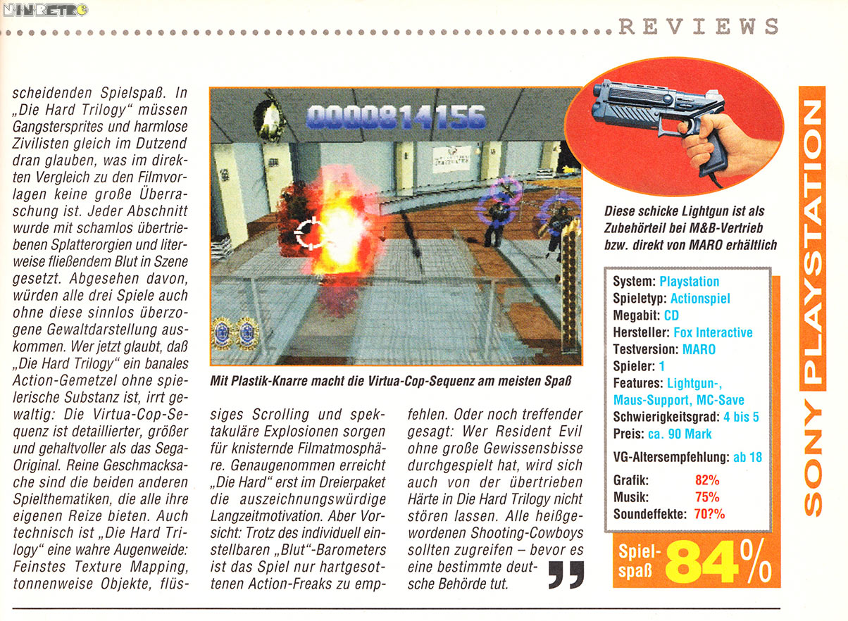 Ich habe damals den Third-Person-Modus ( Die Hard 1 ) und den Lightgun Modus (Die Hard 2 ) mit viel Freude durchgespielt. Das Autofahren ( Die Hard 3 ) habe ich dagegen weniger gut und als äußerst schwierig in Erinnerung. War meiner Meinung nach nicht so der Bringer.