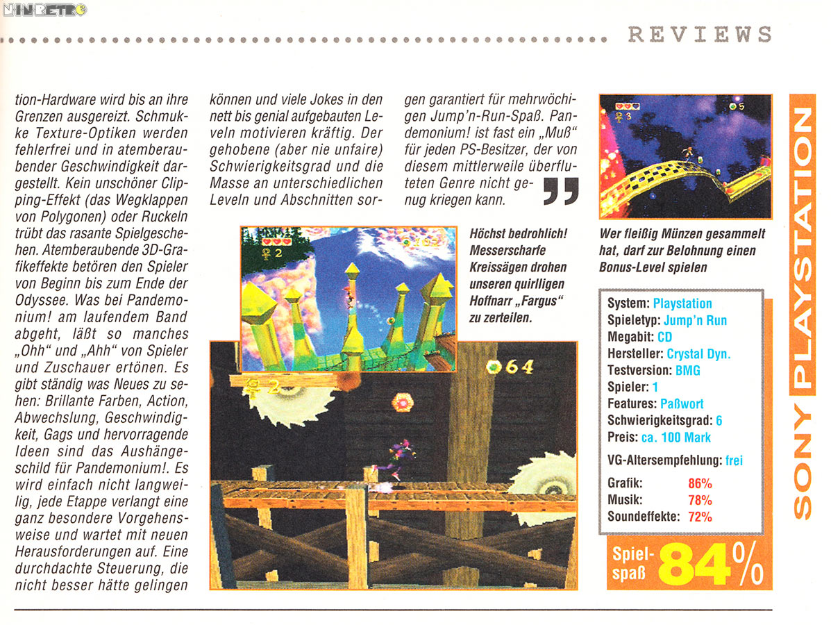 Das Spiel konnte damals imo vor allem wegen der "3D-Ansicht" begeistern, sowie mit generell guter Grafik und gutem Sound. Auch der Schwierigkeitsgrad war relativ einsteigerfreundlich, zumindest meiner Meinung nach, auch wenn etwas anderes im Testbericht der Video Games steht. Im Nachhinein muss ich aber sagen, dass mir auf der PlayStation z.B. Skullmonkeys weitaus besser gefallen hat.