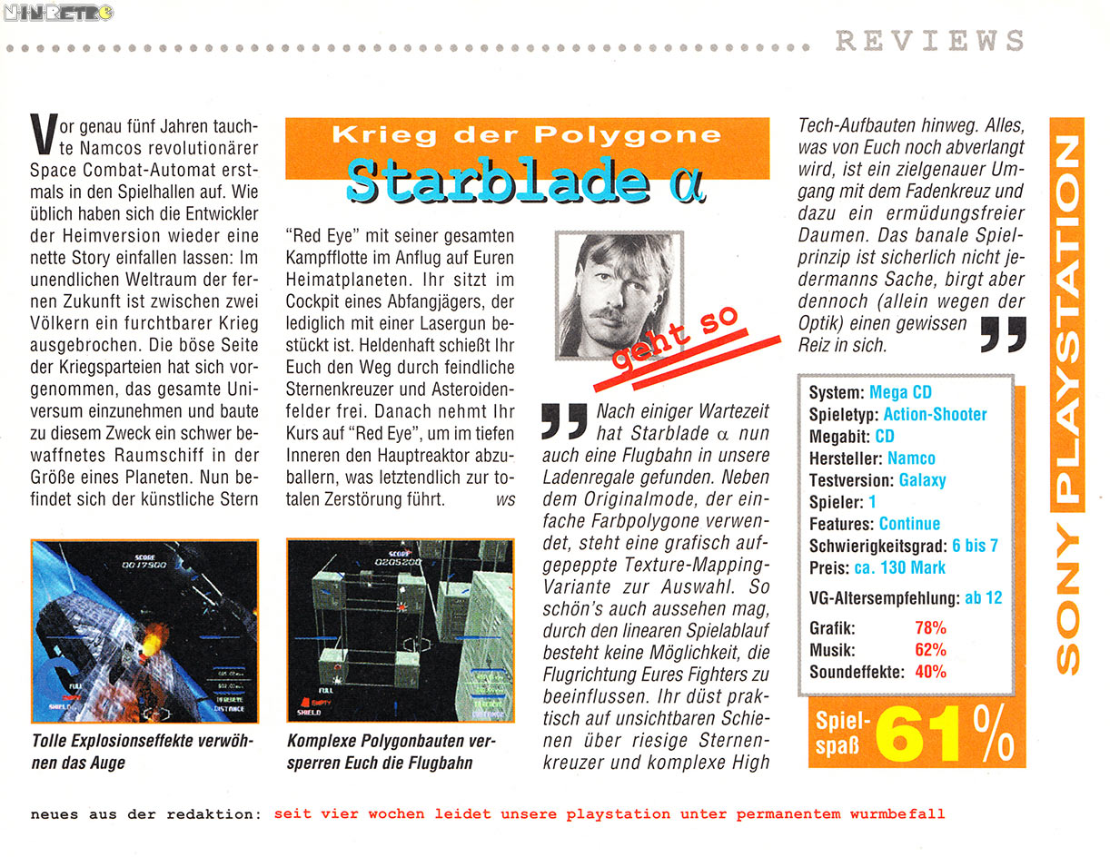 Für mich eine herbe Enttäuschung, in meiner Bewertung spiegelt sich eine persönliche Note wieder. Ich kann mich noch sehr gut daran erinnern wie ich 120DM für dieses Machwerk hingeblättert habe. Außer dem schönen Cover und dem vertrauenswürdigen Siegel "Namco" taugt es nichts. Die Bildrate ist ein Witz und zeigte deutlich die Schwächen der PlayStation. Das zur technischen Seite. Leider ist das Spiel was das Gameplay betrifft genauso schwach. Das Raumschiff fliegt alleine! Man muß nur schießen....mehr nicht. Das muß man sich mal reinziehen, nur schießen. Starwing auf dem SNES zeigt wie man einen Weltraumshooter programmieren muß. Auf der PlayStation hätte man nur die Grafik hübscher machen müssen und vielleicht eine Story integrieren können und so ein Spiel kann der Hit werden. Finger weg von diesem Titel hier.