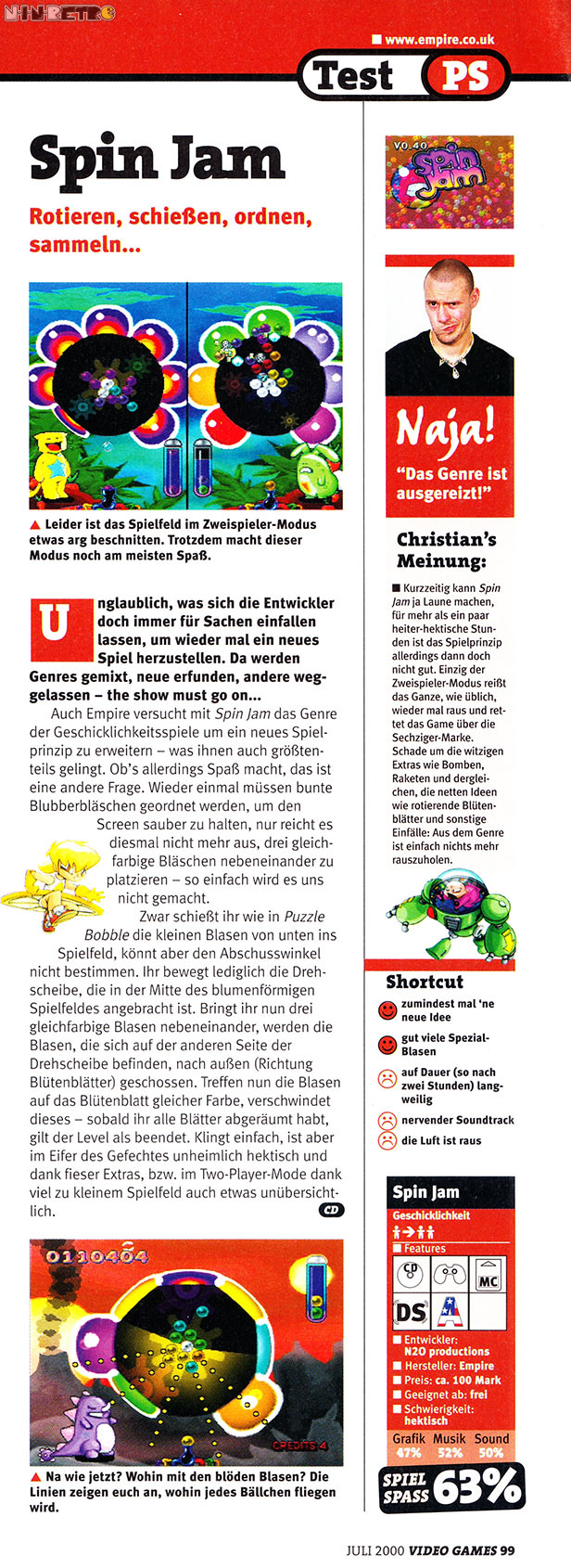WELCOME TO WORLD OF SPIN JAM; AN ULTRA-ADDICTIVE ARCADE-PUZZLER. FEATURING A CAST OF OUTRAGEOUSLY LOVEABLE CHARACTERS. THE IDEA IS TO MATCH THE BALLS, AND SCORE THE POINTS. FAIL TO DO SO AND THE BALLS RETURN, FORCING YOU TO POP AND SPIN WITH INCREASING SPEED AND CO-ORDINATION.