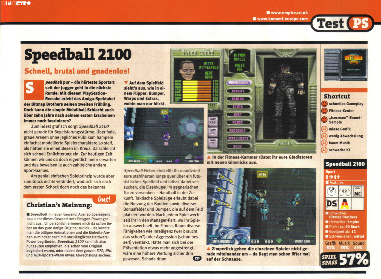 Speedball 2100 kombiniert die Schnelligkeit und Taktik einer Sportsimulation mit den kerzerfrischenden Knochenbrechern eines "Beat-em-up". Das Ergebnis ist das ultimative Ballspiele der Zukunft, in dem 16 gut gepolsterte Teams gegeneinander antreten.