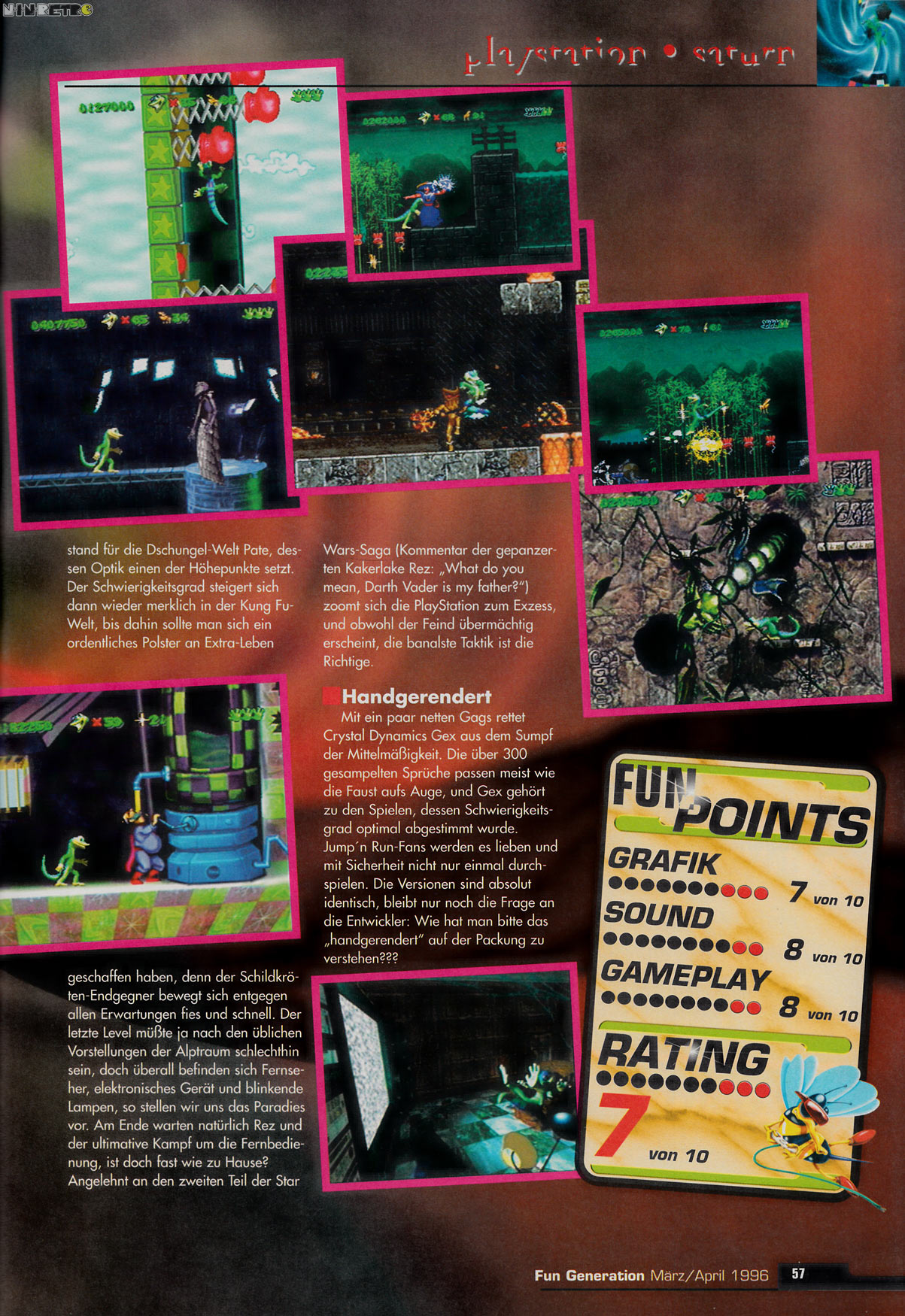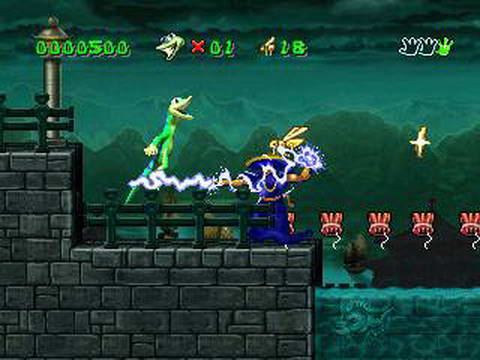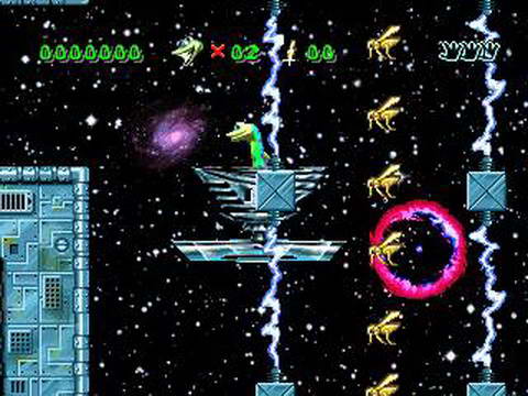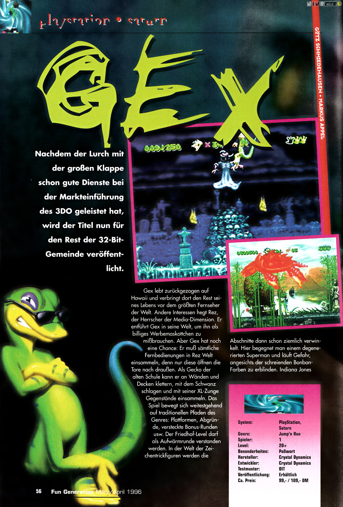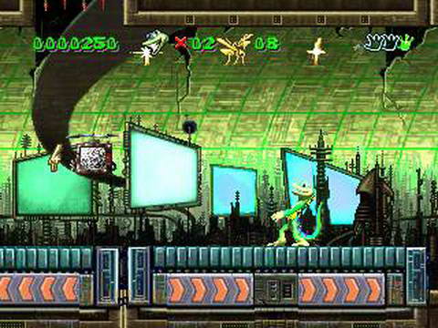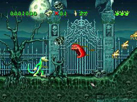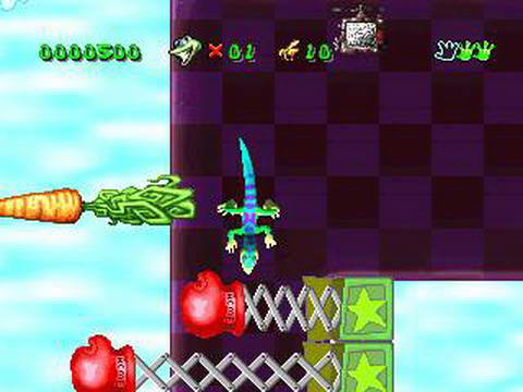 HBO comedian Dana Gould fuels GEX with over 300 hilarious one-liners and sound effects. GEX's mouth gets him in trouble, but it's his thrashing tail and suction cup paws that get him out. GEX has been sucked into the Media Dimension, the place where cheesy 70's movies go to retire. To escape he's gotta kill TVs in each world. (remember that bumper sticker?)