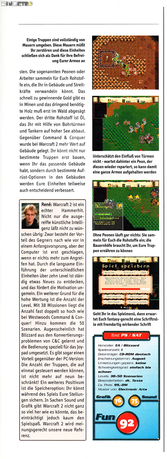 Ich habe das Spiel ja und die letzten Tage nochmal angezockt. Ehrlich gesagt einen Vergleich zwischen den Systemen anzustellen ist immer etwas knifflig finde ich. Die Steuerung am PC mit der Maus ist natürlich simpel und präzise. Die Entwickler haben aber, ähnlich wie die bei Command & Conquer, sehr gute Arbeit bei der Portierung abgeliefert. WarCraft spielt sich auf der PS wunderbar, auch ohne Maus. Die Story und allgemein die Fantasywelt sind für mich über jeden Zweifel erhaben. Das paßt. Übrigens hat mich die comicartige Grafik damals sehr überrascht. Entgegen dem Trend immer realistischere Grafiken abzuliefern, hat die WarCraft Saga ihren eigenen Stil entwickelt und behält sie noch bis Heute bei. Mit Gewalt in Spielen gab es so nie Probleme und die Titel waren immer sehr Farbenfroh. Fantasy halt. Das finde ich an der Serie am gelungensten (muß mich aber outen, WoW habe ich noch nie gespielt).