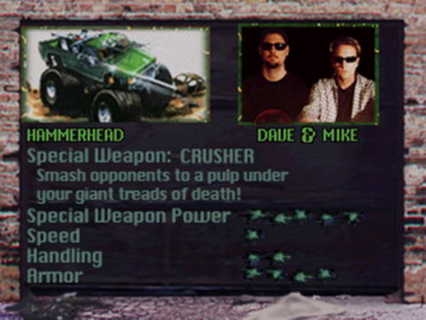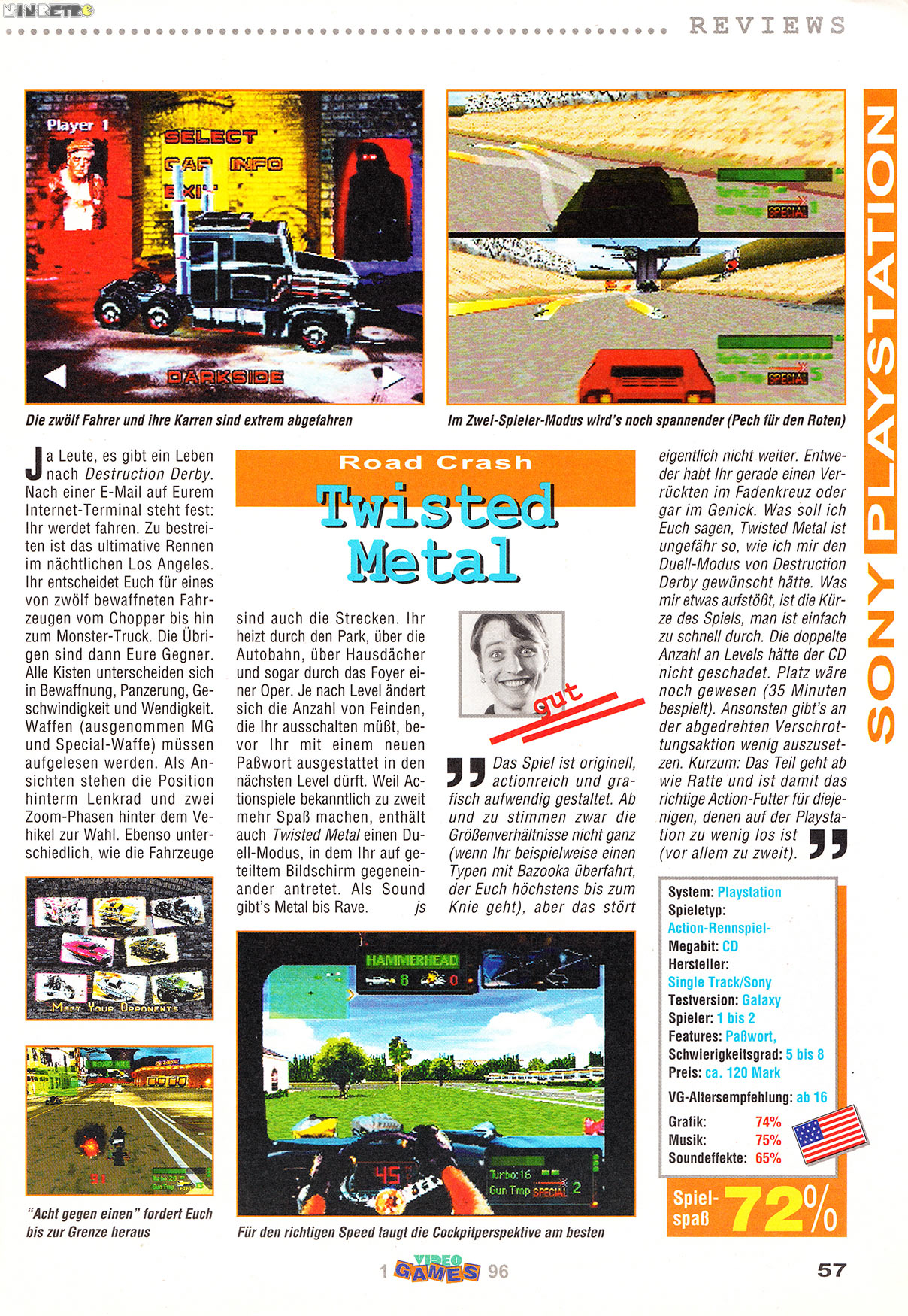 Vereinfacht gesagt bietet Twisted Metal als Spielprinzip den Battle-Modus von Super Mario Kart ohne Knuddelfaktor und mit durchgeknallten Psychopathen als Charakteren. Die Charaktere und die Präsentation des Spiels haben einen gewissen trashigen Charme und eben das macht für mich den Reiz aus.
