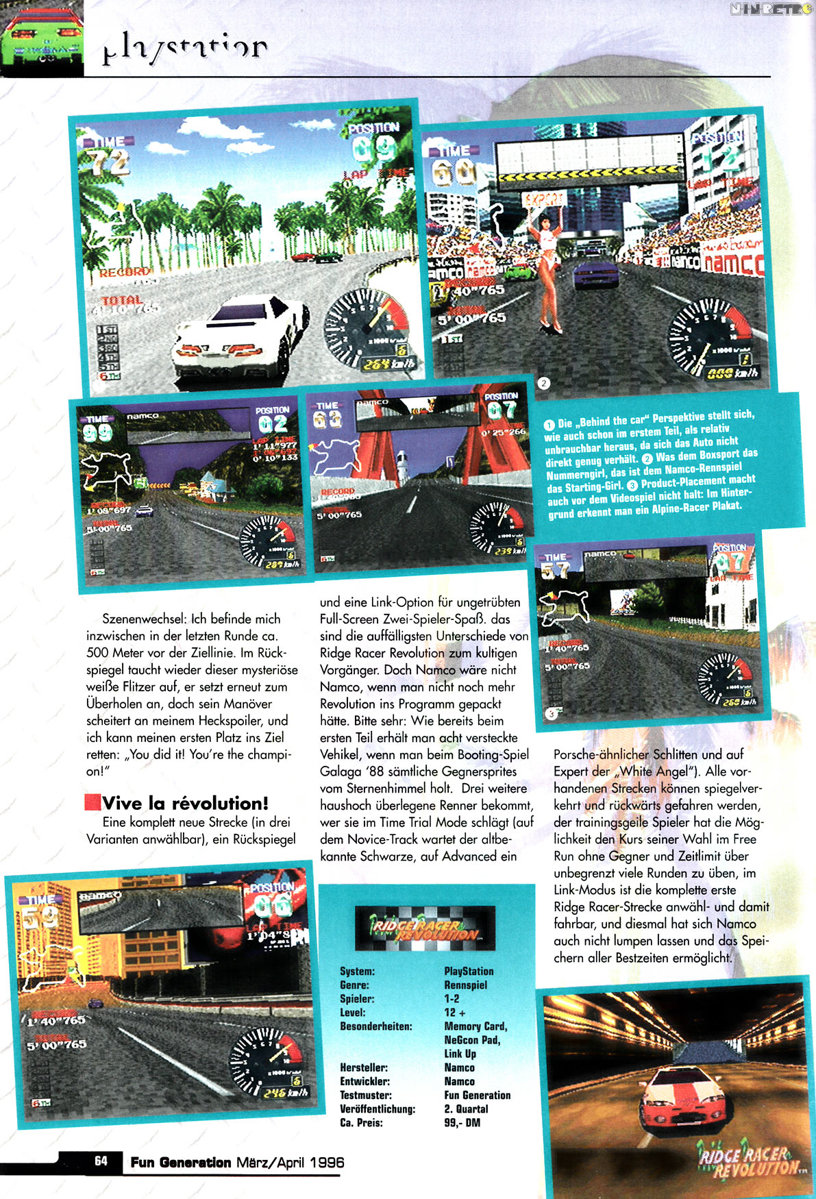 Ridge Racer Revolution war damals mein erstes PlayStation-Spiel das ich mir zusammen mit der Konsole gekauft habe. Wenn man zuvor nur SNES-Grafik gewohnt war, war die Optik natürlich der Hammer schlechthin und die Musikuntermalung tat ihr übriges,... zumal ja zu jener Zeit Techno auch recht angesagt war.