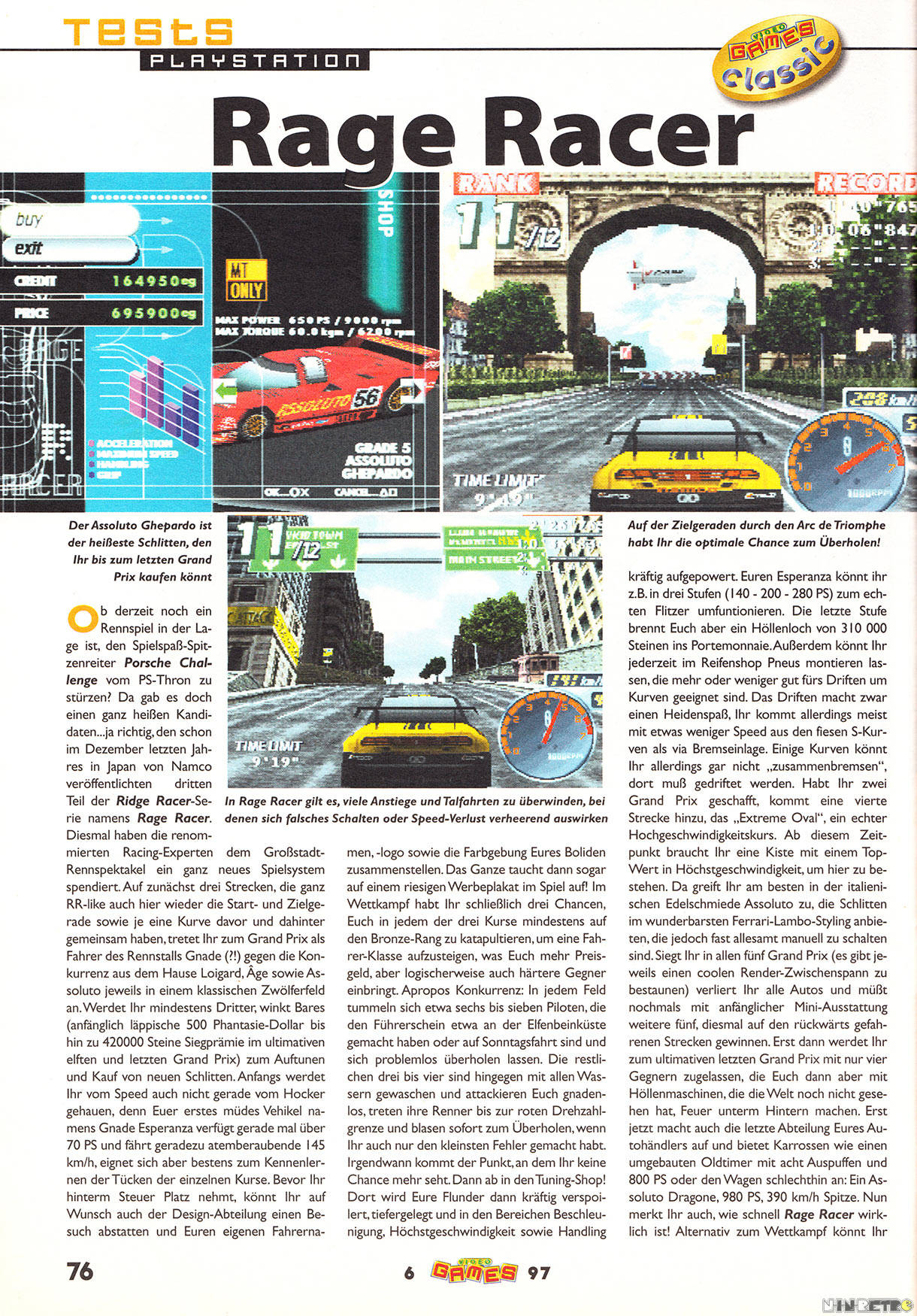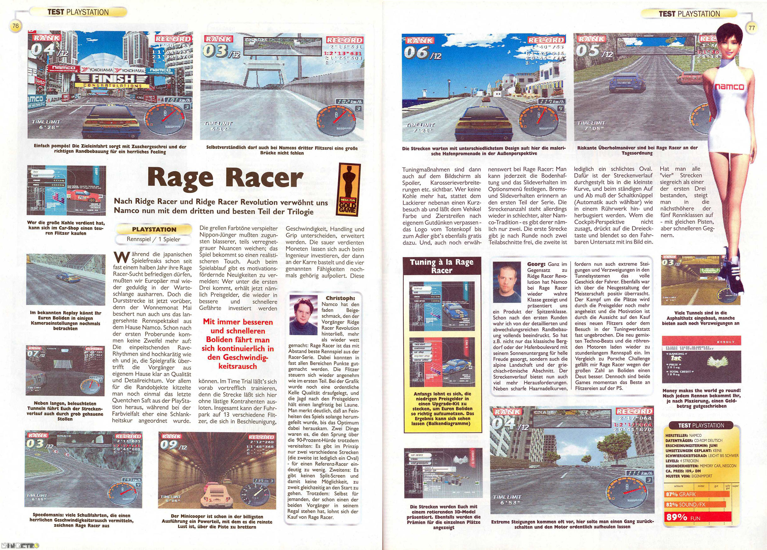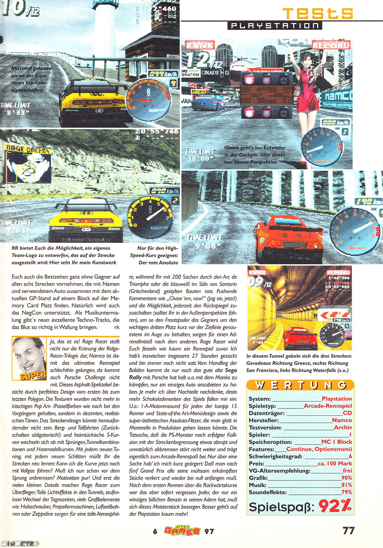 Mein erstes Playstation Spiel! RAGE RACER. Die Kurse sind für mich in Stein gemeißelte Kunstwerke und Lernkurve wie Motivation sind imo nach wie vor Lehrstücke des Arcade-Racer-Genres für Konsole. Ralphs "Ja, das ist es!" ist für mich untrennbar mit RAGE RACER verbunden. Auch wenn ich von Herrn Karels Person an sich überhaupt nicht überzeugt bin wurde mir persönlich mit diesem Test klar, dass der Mann und ich den gleichen Geschmack in Sachen Videospiele haben (im krassen Gegensatz zu seinen musikalischen Vorlieben wie z.B. Eiffel 65 ... würg!!).